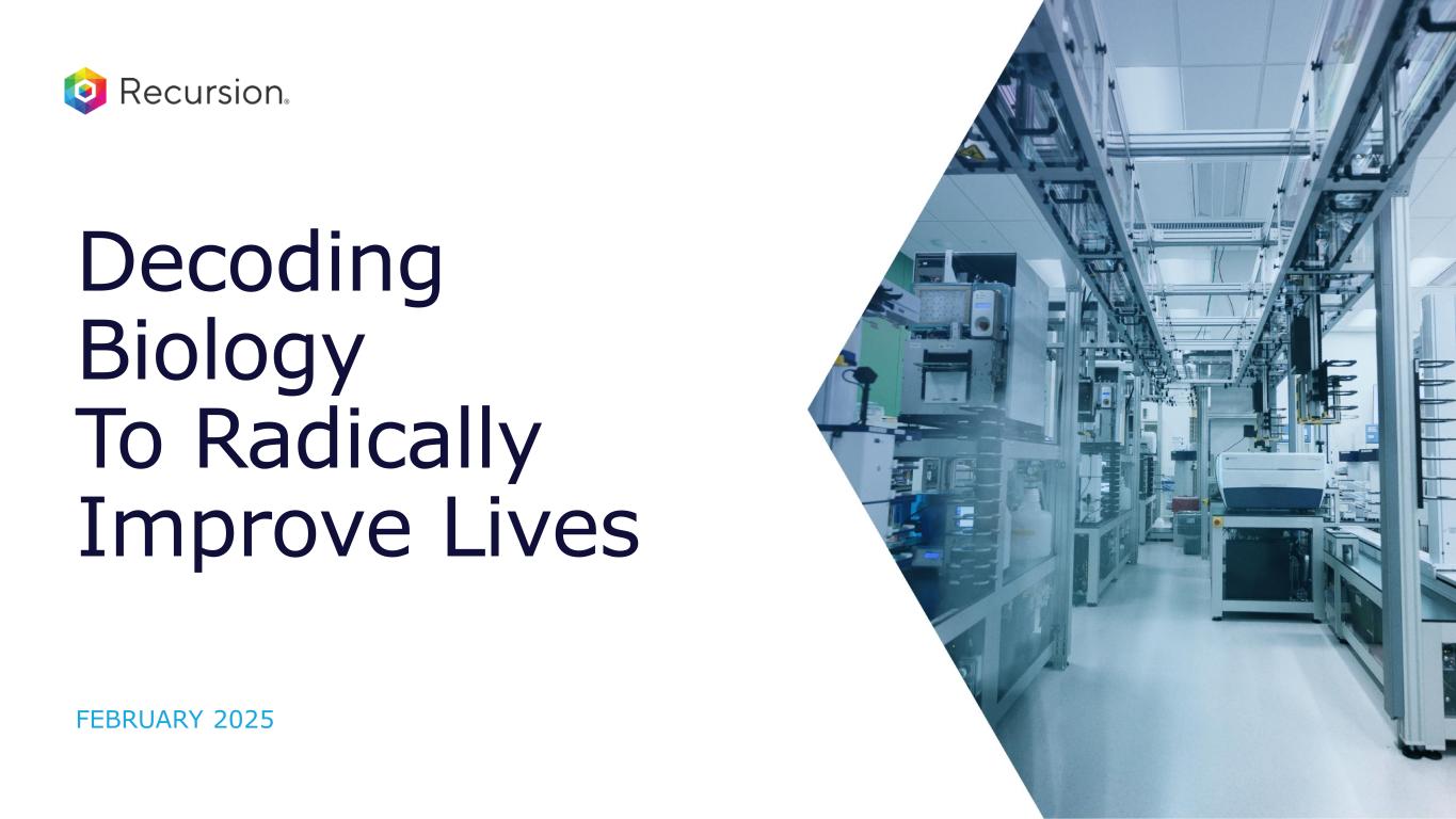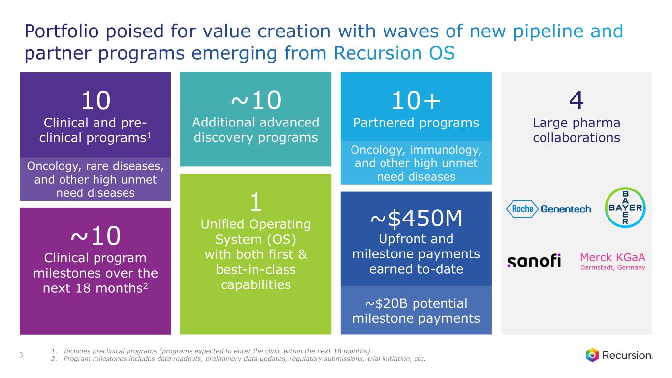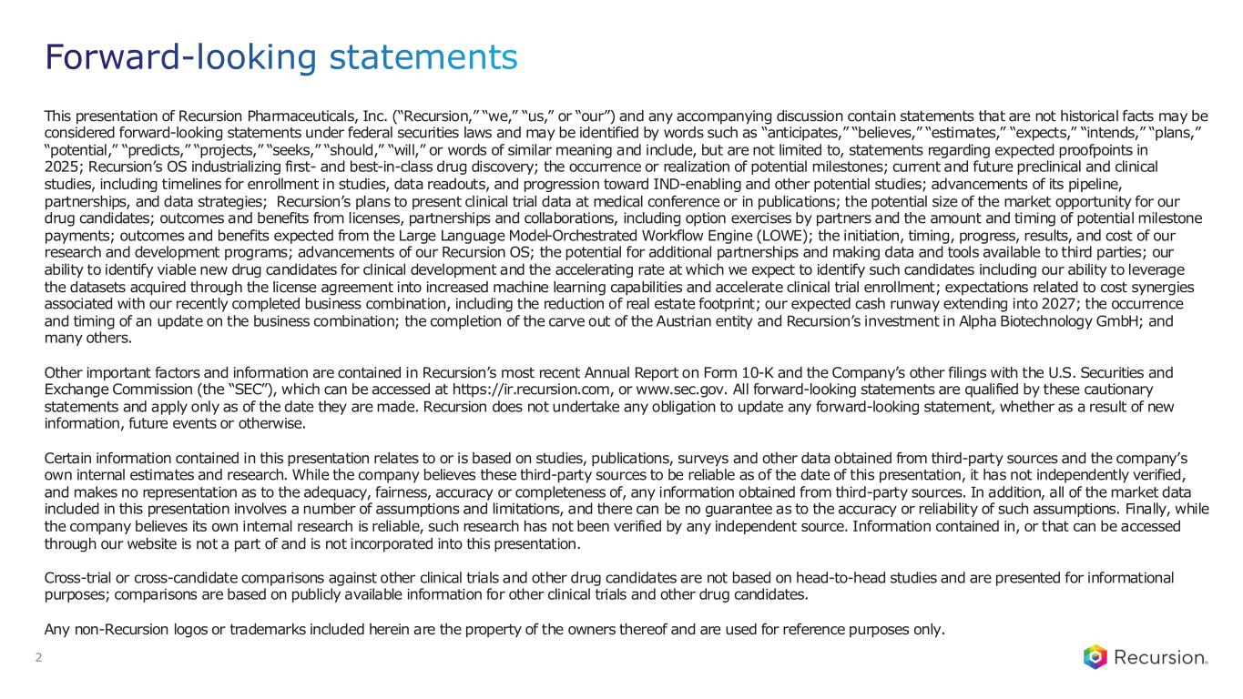 Forward-looking statements 2 This presentation of Recursion Pharmaceuticals, Inc. (“Recursion,” “we,” “us,” or “our”) and any accompanying discussion contain statements that are not historical facts may be considered forward-looking statements under federal securities laws and may be identified by words such as “anticipates,” “believes,” “estimates,” “expects,” “intends,” “plans,” “potential,” “predicts,” “projects,” “seeks,” “should,” “will,” or words of similar meaning and include, but are not limited to, statements regarding expected proofpoints in 2025; Recursion’s OS industrializing first- and best-in-class drug discovery; the occurrence or realization of potential milestones; current and future preclinical and clinical studies, including timelines for enrollment in studies, data readouts, and progression toward IND-enabling and other potential studies; advancements of its pipeline, partnerships, and data strategies; Recursion’s plans to present clinical trial data at medical conference or in publications; the potential size of the market opportunity for our drug candidates; outcomes and benefits from licenses, partnerships and collaborations, including option exercises by partners and the amount and timing of potential milestone payments; outcomes and benefits expected from the Large Language Model-Orchestrated Workflow Engine (LOWE); the initiation, timing, progress, results, and cost of our research and development programs; advancements of our Recursion OS; the potential for additional partnerships and making data and tools available to third parties; our ability to identify viable new drug candidates for clinical development and the accelerating rate at which we expect to identify such candidates including our ability to leverage the datasets acquired through the license agreement into increased machine learning capabilities and accelerate clinical trial enrollment; expectations related to cost synergies associated with our recently completed business combination, including the reduction of real estate footprint; our expected cash runway extending into 2027; the occurrence and timing of an update on the business combination; the completion of the carve out of the Austrian entity and Recursion’s investment in Alpha Biotechnology GmbH; and many others. Other important factors and information are contained in Recursion’s most recent Annual Report on Form 10-K and the Company’s other filings with the U.S. Securities and Exchange Commission (the “SEC”), which can be accessed at https://ir.recursion.com, or www.sec.gov. All forward-looking statements are qualified by these cautionary statements and apply only as of the date they are made. Recursion does not undertake any obligation to update any forward-looking statement, whether as a result of new information, future events or otherwise. Certain information contained in this presentation relates to or is based on studies, publications, surveys and other data obtained from third-party sources and the company’s own internal estimates and research. While the company believes these third-party sources to be reliable as of the date of this presentation, it has not independently verified, and makes no representation as to the adequacy, fairness, accuracy or completeness of, any information obtained from third-party sources. In addition, all of the market data included in this presentation involves a number of assumptions and limitations, and there can be no guarantee as to the accuracy or reliability of such assumptions. Finally, while the company believes its own internal research is reliable, such research has not been verified by any independent source. Information contained in, or that can be accessed through our website is not a part of and is not incorporated into this presentation. Cross-trial or cross-candidate comparisons against other clinical trials and other drug candidates are not based on head-to-head studies and are presented for informational purposes; comparisons are based on publicly available information for other clinical trials and other drug candidates. Any non-Recursion logos or trademarks included herein are the property of the owners thereof and are used for reference purposes only.