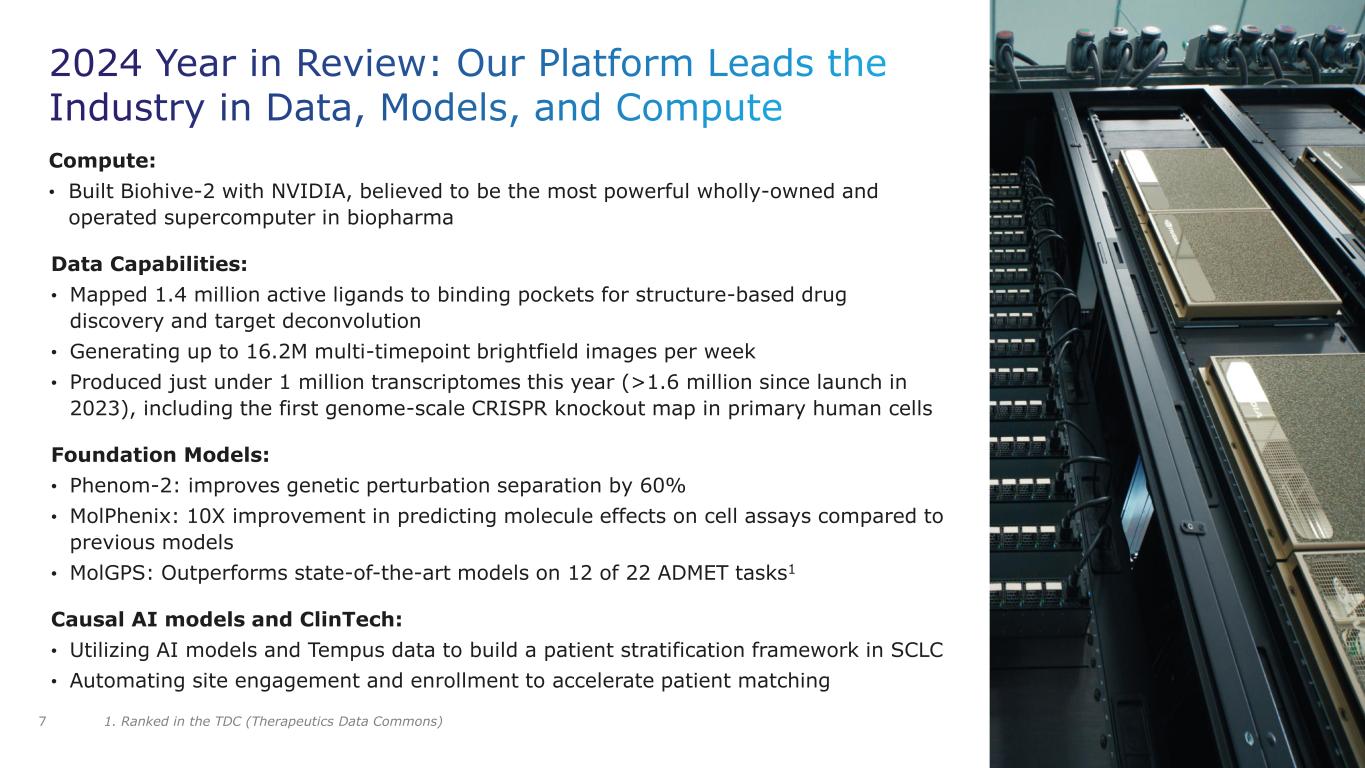 2024 Year in Review: Partnerships Delivering Meaningful Milestones Sanofi Advanced two programs through initial milestones, generating $15 million in aggregate payments 6 Roche-Genentech Generated multiple whole-genome phenomaps in oncology and neuro to uncover new targets and potential therapies; $30M in milestones received Bayer Delivered 25 multimodal oncology data packages and LOWE software to enhance research capabilities Merck KGaA Advanced alliance in oncology and immunology targets