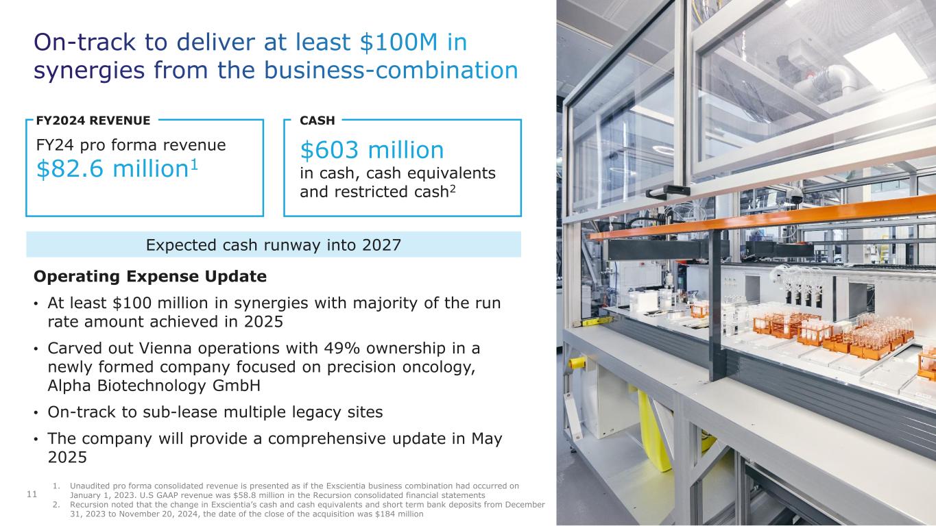 On-track to deliver at least $100M in synergies from the business-combination 14 Operating Expense Update • At least $100 million in synergies with majority of the run rate amount achieved in 2025 • Carved out Vienna operations with 49% ownership in a newly formed company focused on precision oncology, Alpha Biotechnology GmbH • On-track to sub-lease multiple legacy sites • The company will provide a comprehensive update in May 2025 FY2024 REVENUE FY24 pro forma revenue $82.6 million1 CASH $603 million in cash, cash equivalents and restricted cash2 1. Unaudited pro forma consolidated revenue is presented as if the Exscientia business combination had occurred on January 1, 2023. U.S GAAP revenue was $58.8 million in the Recursion consolidated financial statements 2. Recursion noted that the change in Exscientia’s cash and cash equivalents and short term bank deposits from December 31, 2023 to November 20, 2024, the date of the close of the acquisition was $184 million Expected cash runway into 2027