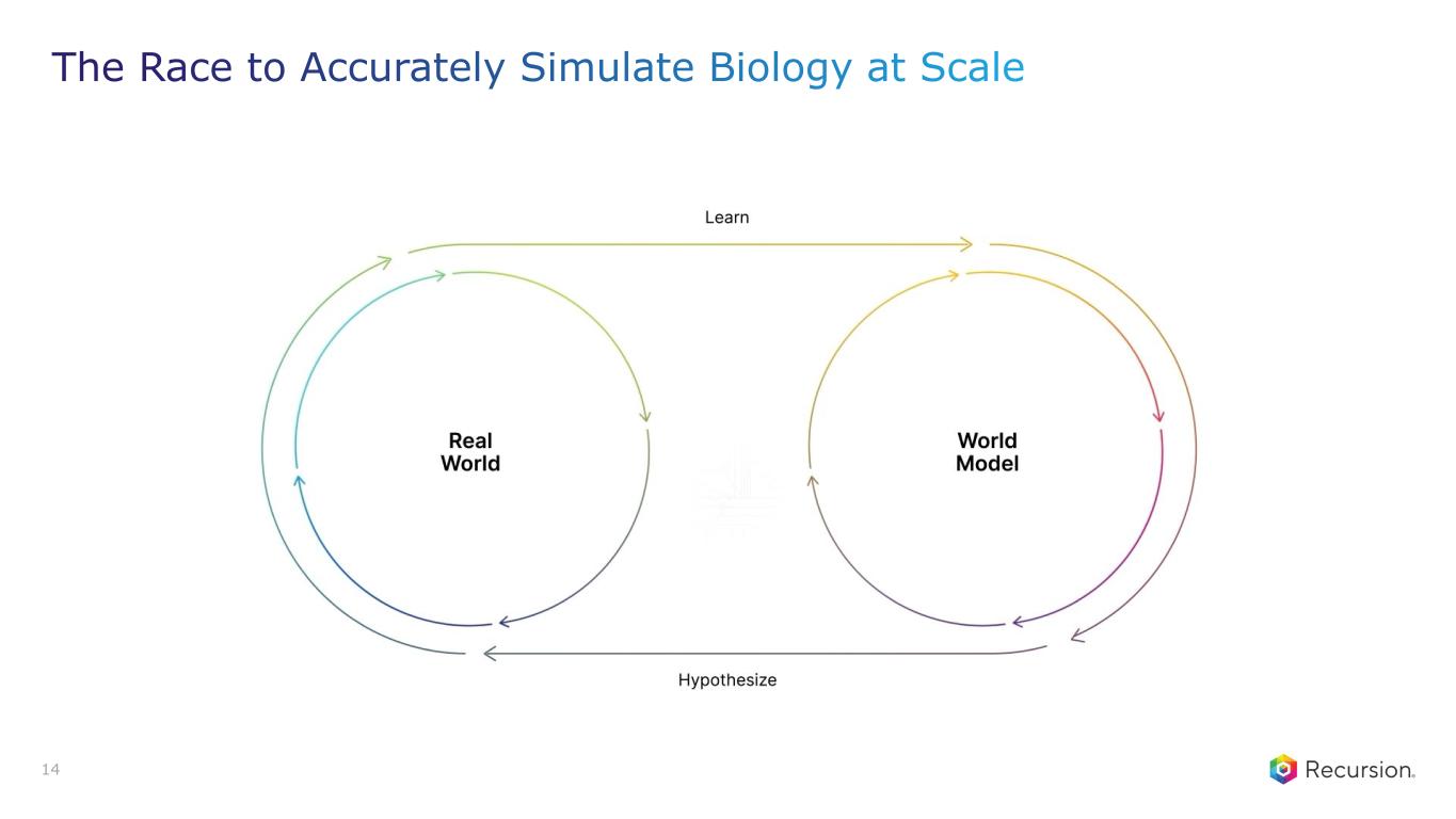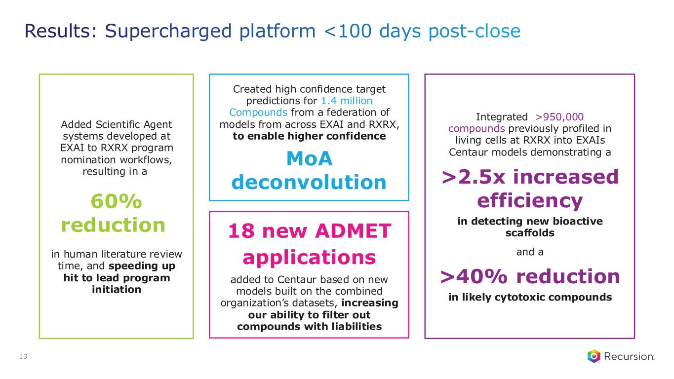 Results: Supercharged platform <100 days post-close 13 Created high confidence target predictions for 1.4 million Compounds from a federation of models from across EXAI and RXRX, to enable higher confidence MoA deconvolution 18 new ADMET applications added to Centaur based on new models built on the combined organization’s datasets, increasing our ability to filter out compounds with liabilities Integrated >950,000 compounds previously profiled in living cells at RXRX into EXAIs Centaur models demonstrating a >2.5x increased efficiency in detecting new bioactive scaffolds and a >40% reduction in likely cytotoxic compounds Added Scientific Agent systems developed at EXAI to RXRX program nomination workflows, resulting in a 60% reduction in human literature review time, and speeding up hit to lead program initiation