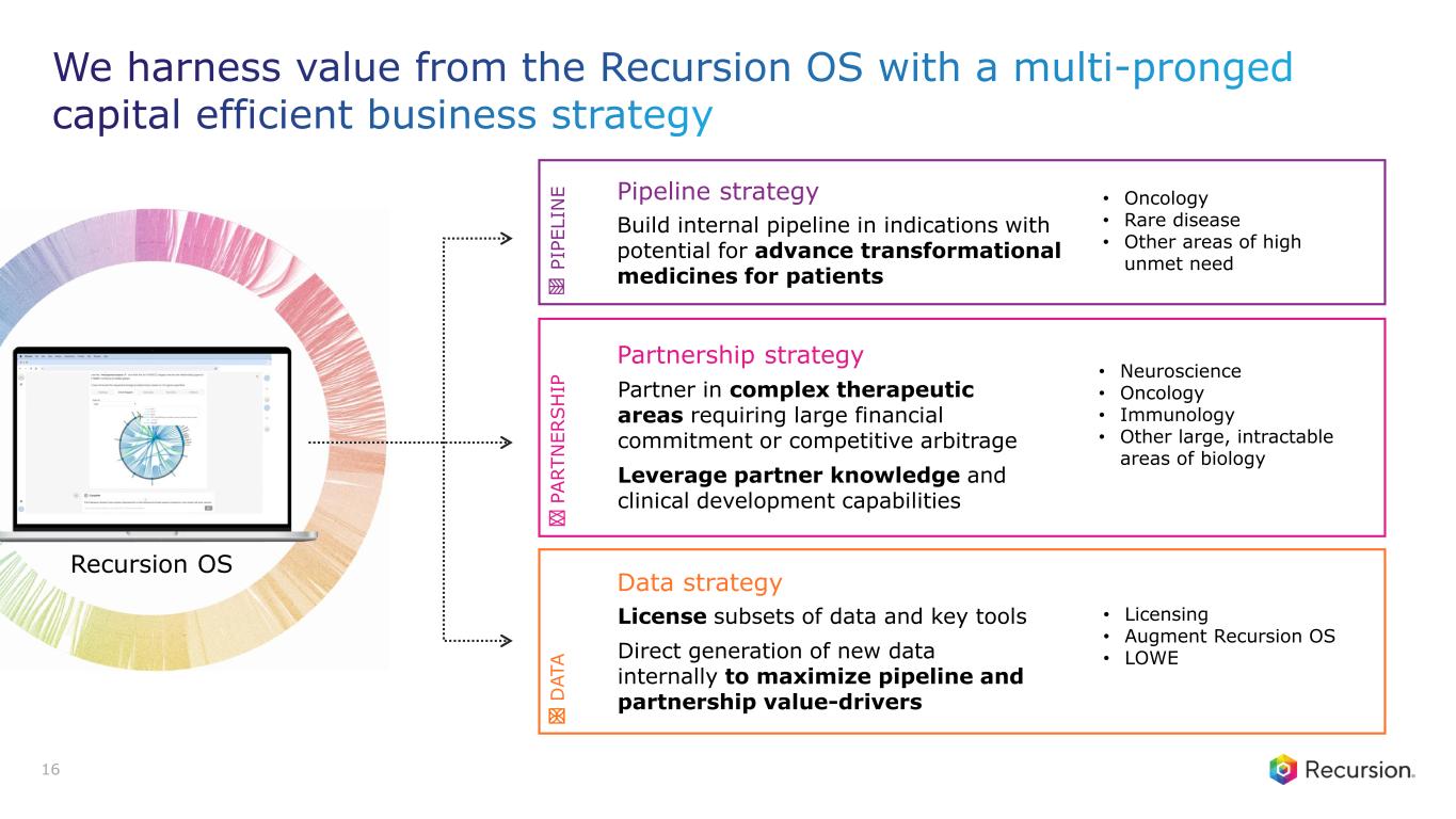 MICRO Pathway Model MACRO Largest, fit-for-purpose perturbative biology + foundation models make Recursion a leader Protein Model Increasingly commoditized – Partnering with builders of frontier models for early access Atomistic Model AI + QM/MD + Compute = Recipe for leadership 15 The Race to Accurately Simulate Biology at Scale Patient Models Real-world patient data + AI