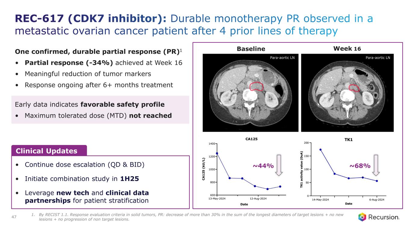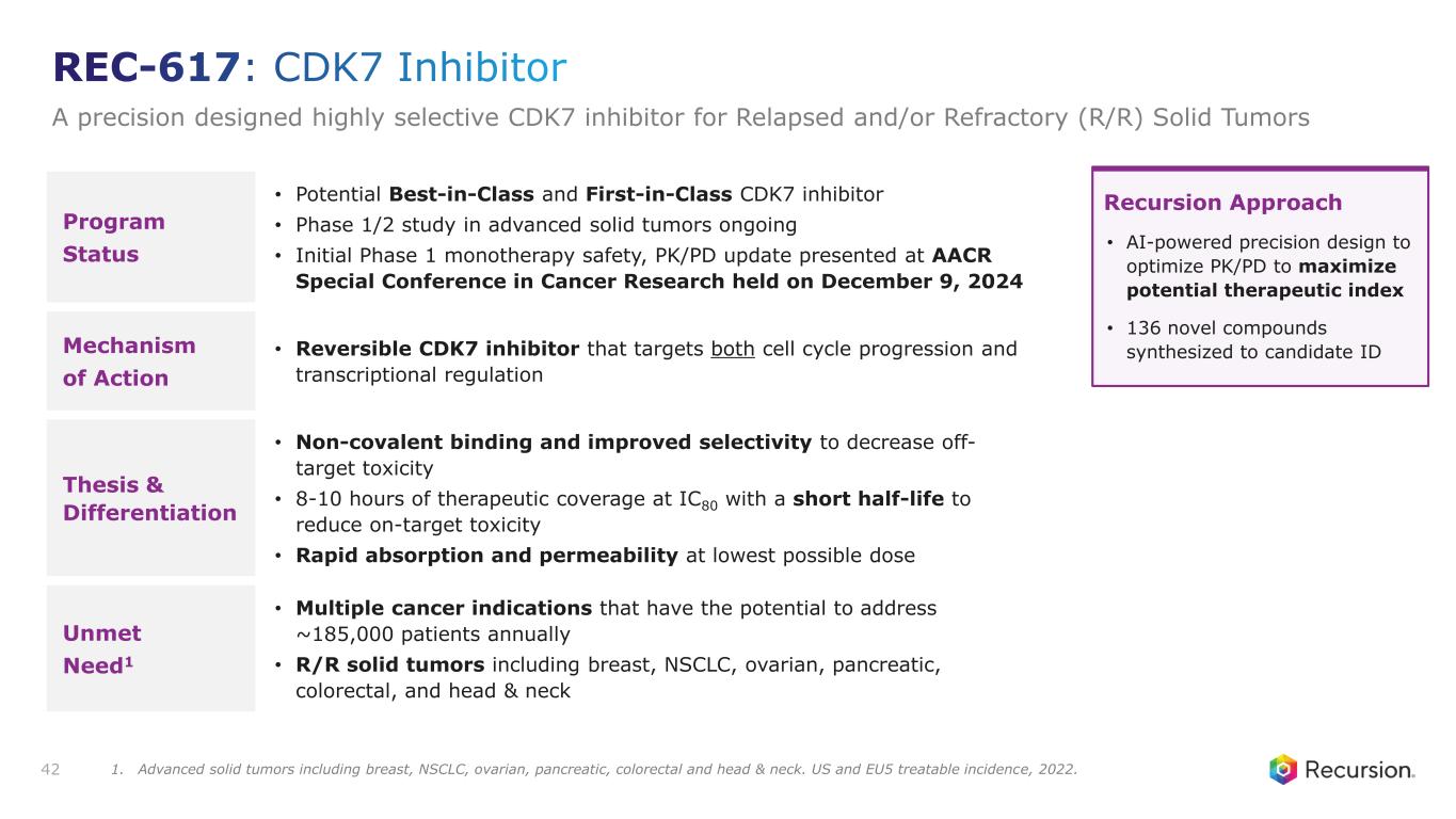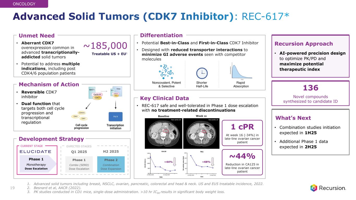 ◦REC-617: A potential best-in-class CDK7 inhibitor optimized using our AI platform, delivered early Phase 1/2 results demonstrating promising safety and efficacy, including a durable partial response in a late-stage metastatic ovarian cancer patient and stable disease across four other patients with solid tumors (e.g. CRC, NSCLC). These findings support further clinical development as the Company continues to explore its potential in combination regimens.