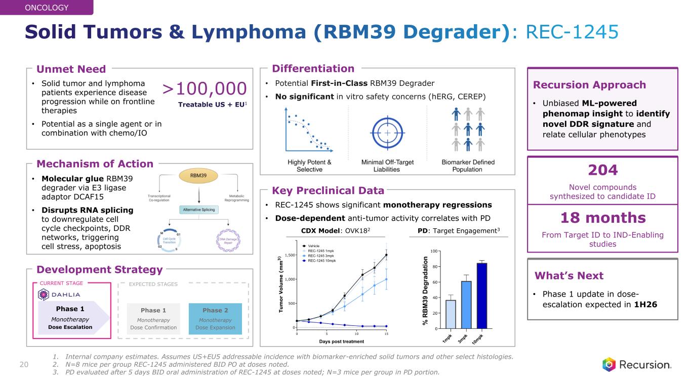 • Aberrant CDK7 overexpression common in advanced transcriptionally- addicted solid tumors • Potential to address multiple indications, including post CDK4/6 population patients • Potential Best-in-Class and First-in-Class CDK7 Inhibitor • Designed with reduced transporter interactions to minimize GI adverse events seen with competitor molecules • Reversible CDK7 inhibitor • Dual function that targets both cell cycle progression and transcriptional regulation ~185,000 Treatable US + EU1 Mechanism of Action Unmet Need Differentiation Recursion Approach • AI-powered precision design to optimize PK/PD and maximize potential therapeutic index What’s Next • Combination studies initiation expected in 1H25 • Additional Phase 1 data expected in 2H25 19 Development Strategy Phase 2 Combination Dose Expansion Phase 1 Monotherapy Dose Escalation Q1 2025 CURRENT STAGE EXPECTED STAGES Phase 1 Combo (SERD) Dose Escalation H2 2025 • REC-617 safe and well-tolerated in Phase 1 dose escalation with no treatment-related discontinuations Key Clinical Data 136 Novel compounds synthesized to candidate ID ONCOLOGY Advanced Solid Tumors (CDK7 Inhibitor): REC-617* 1 cPR At week 16 (-34%) in late-line ovarian cancer patient ~44% Reduction in CA125 in late-line ovarian cancer patient 1. Advanced solid tumors including breast, NSCLC, ovarian, pancreatic, colorectal and head & neck. US and EU5 treatable incidence, 2022. 2. Besnard et al, AACR (2022). 3. PK studies conducted in CD1 mice, single-dose administration. >10 hr IC80 results in significant body weight loss.