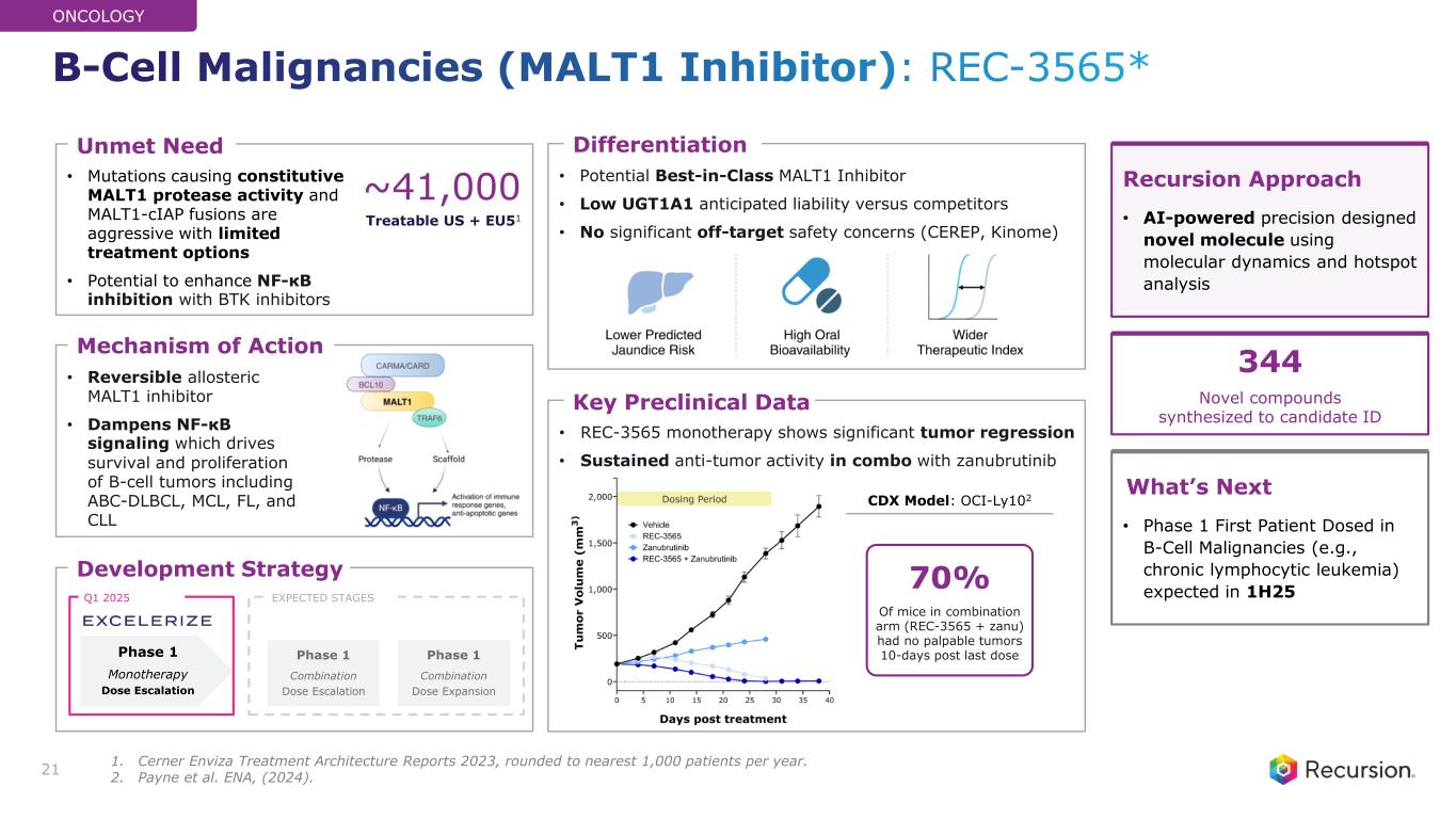 • Molecular glue RBM39 degrader via E3 ligase adaptor DCAF15 • Disrupts RNA splicing to downregulate cell cycle checkpoints, DDR networks, triggering cell stress, apoptosis • Potential First-in-Class RBM39 Degrader • No significant in vitro safety concerns (hERG, CEREP) • Solid tumor and lymphoma patients experience disease progression while on frontline therapies • Potential as a single agent or in combination with chemo/IO • REC-1245 shows significant monotherapy regressions • Dose-dependent anti-tumor activity correlates with PD Key Preclinical Data Mechanism of Action Unmet Need Differentiation Development Strategy Phase 2 Monotherapy Dose Expansion Phase 1 Monotherapy Dose Escalation CURRENT STAGE EXPECTED STAGES 20 Phase 1 Monotherapy Dose Confirmation Recursion Approach • Unbiased ML-powered phenomap insight to identify novel DDR signature and relate cellular phenotypes What’s Next • Phase 1 update in dose- escalation expected in 1H26 >100,000 Treatable US + EU1 204 Novel compounds synthesized to candidate ID 18 months From Target ID to IND-Enabling studies ONCOLOGY PD: Target Engagement3CDX Model: OVK182 Solid Tumors & Lymphoma (RBM39 Degrader): REC-1245 1. Internal company estimates. Assumes US+EU5 addressable incidence with biomarker-enriched solid tumors and other select histologies. 2. N=8 mice per group REC-1245 administered BID PO at doses noted. 3. PD evaluated after 5 days BID oral administration of REC-1245 at doses noted; N=3 mice per group in PD portion.