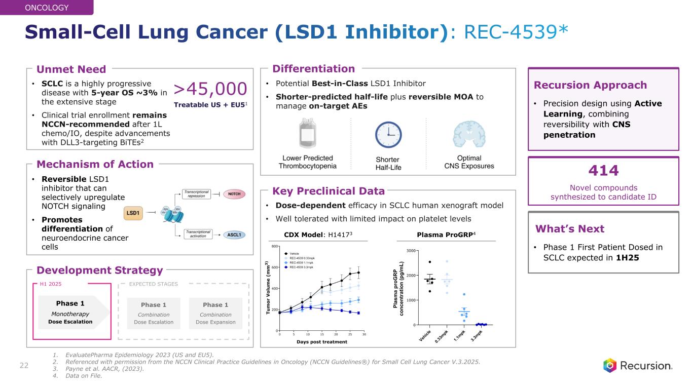 • SCLC is a highly progressive disease with 5-year OS ~3% in the extensive stage • Clinical trial enrollment remains NCCN-recommended after 1L chemo/IO, despite advancements with DLL3-targeting BiTEs2 • Potential Best-in-Class LSD1 Inhibitor • Shorter-predicted half-life plus reversible MOA to manage on-target AEs • Dose-dependent efficacy in SCLC human xenograft model • Well tolerated with limited impact on platelet levels • Reversible LSD1 inhibitor that can selectively upregulate NOTCH signaling • Promotes differentiation of neuroendocrine cancer cells Key Preclinical Data Mechanism of Action Unmet Need Differentiation >45,000 Treatable US + EU51 22 Recursion Approach • Precision design using Active Learning, combining reversibility with CNS penetration What’s Next • Phase 1 First Patient Dosed in SCLC expected in 1H25 Development Strategy Phase 1 Combination Dose Expansion Phase 1 Combination Dose Escalation Phase 1 Monotherapy Dose Escalation H1 2025 EXPECTED STAGES 414 Novel compounds synthesized to candidate ID ONCOLOGY Plasma ProGRP4CDX Model: H14173 Small-Cell Lung Cancer (LSD1 Inhibitor): REC-4539* 1. EvaluatePharma Epidemiology 2023 (US and EU5). 2. Referenced with permission from the NCCN Clinical Practice Guidelines in Oncology (NCCN Guidelines®) for Small Cell Lung Cancer V.3.2025. 3. Payne et al. AACR, (2023). 4. Data on File.