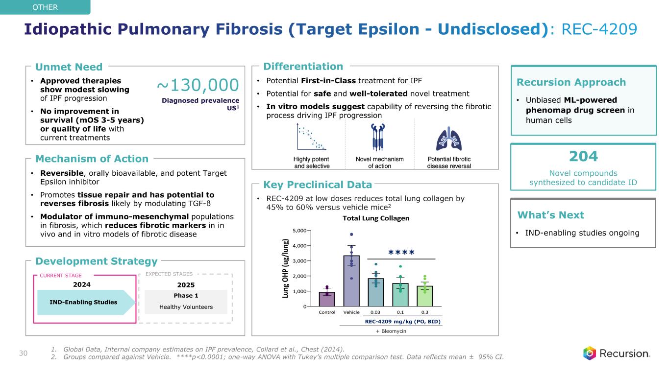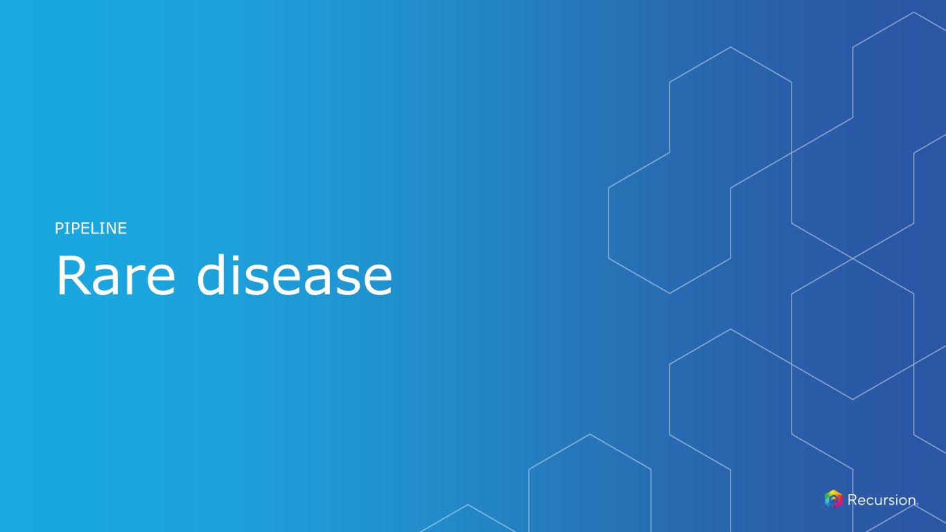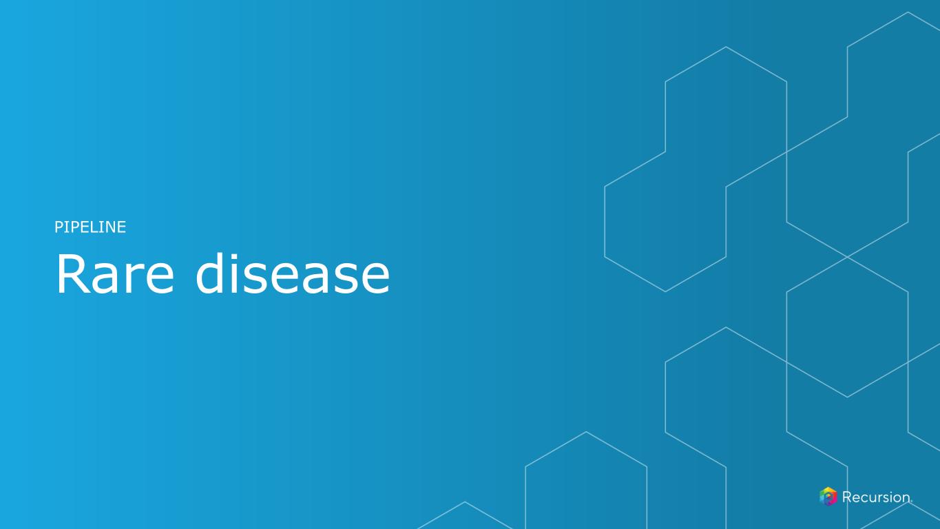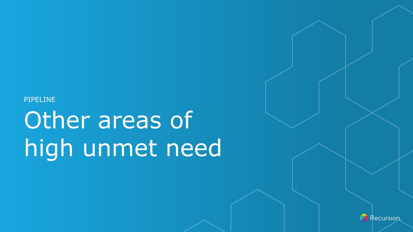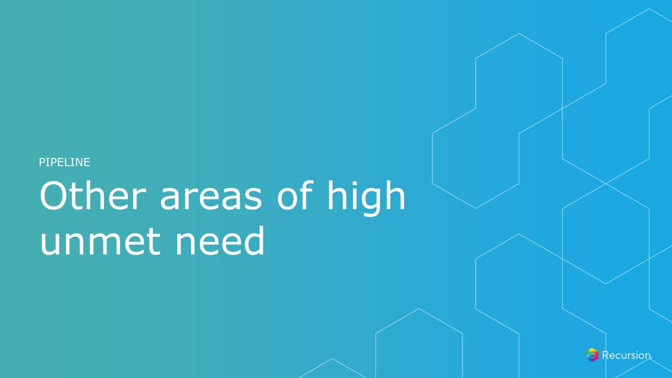 • Approved therapies show modest slowing of IPF progression • No improvement in survival (mOS 3-5 years) or quality of life with current treatments • Potential First-in-Class treatment for IPF • Potential for safe and well-tolerated novel treatment • In vitro models suggest capability of reversing the fibrotic process driving IPF progression • REC-4209 at low doses reduces total lung collagen by 45% to 60% versus vehicle mice2 • Reversible, orally bioavailable, and potent Target Epsilon inhibitor • Promotes tissue repair and has potential to reverses fibrosis likely by modulating TGF-ß • Modulator of immuno-mesenchymal populations in fibrosis, which reduces fibrotic markers in in vivo and in vitro models of fibrotic disease Key Preclinical Data Mechanism of Action Unmet Need Differentiation Development Strategy Control Vehicle 0.03 0.1 0.3 0 1,000 2,000 3,000 4,000 5,000 Total Lung Collagen Lu ng O H P (u g/ lu ng ) 30 ~130,000 Diagnosed prevalence US1 Recursion Approach • Unbiased ML-powered phenomap drug screen in human cells What’s Next • IND-enabling studies ongoing IND-Enabling Studies CURRENT STAGE Phase 1 Healthy Volunteers 20252024 EXPECTED STAGES 204 Novel compounds synthesized to candidate ID OTHER REC-4209 mg/kg (PO, BID) + Bleomycin **** Idiopathic Pulmonary Fibrosis (Target Epsilon - Undisclosed): REC-4209 1. Global Data, Internal company estimates on IPF prevalence, Collard et al., Chest (2014). 2. Groups compared against Vehicle. ****p<0.0001; one-way ANOVA with Tukey’s multiple comparison test. Data reflects mean ± 95% CI.