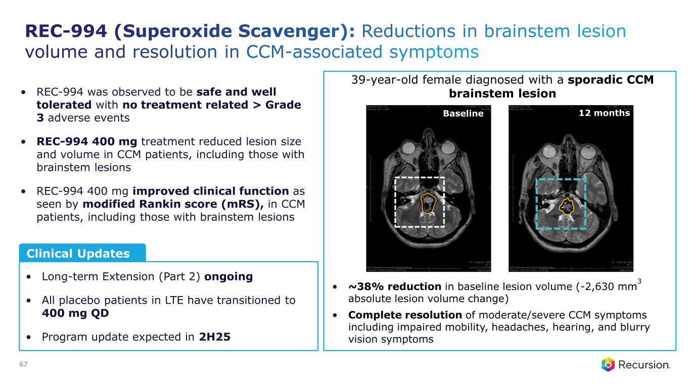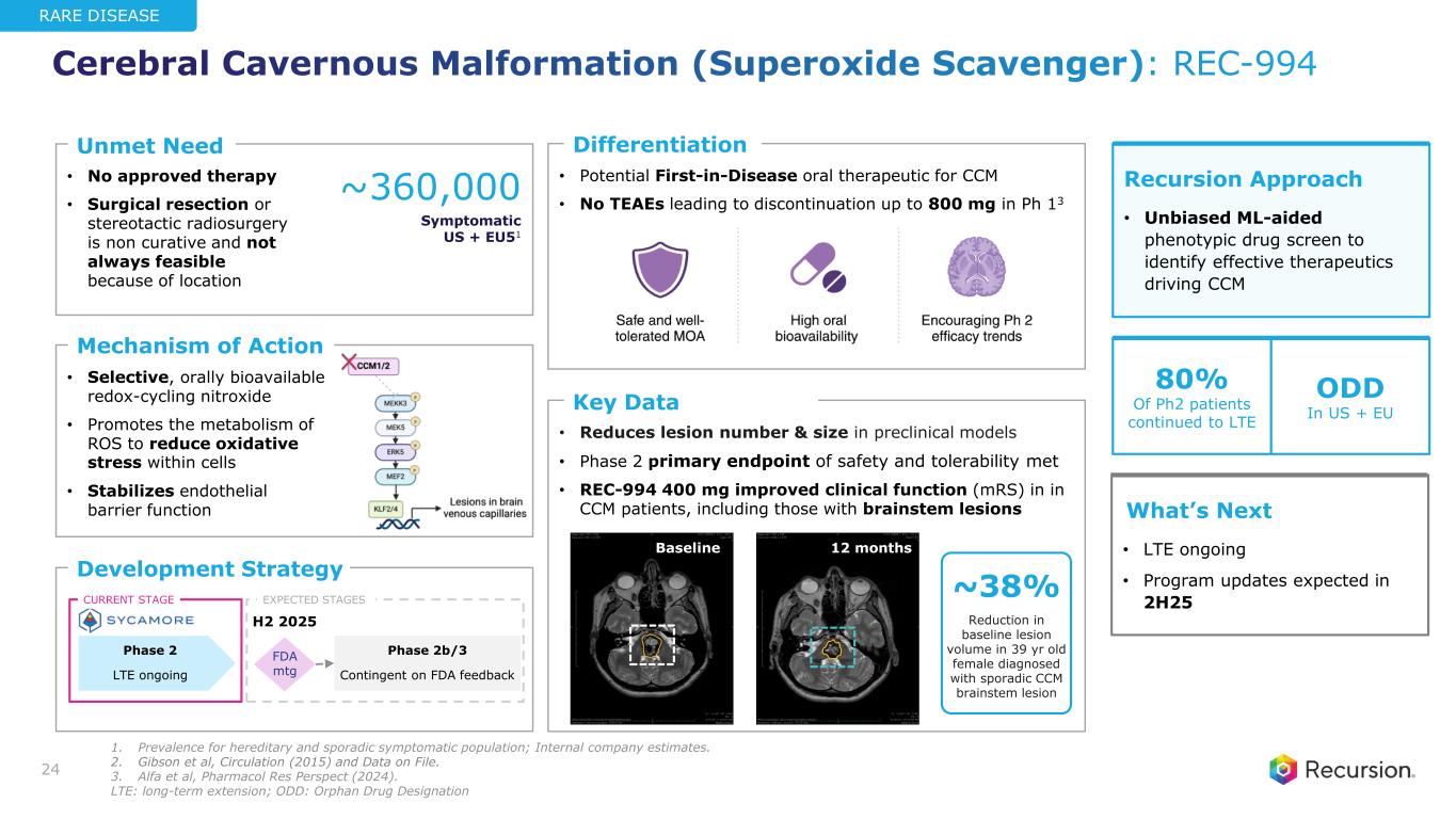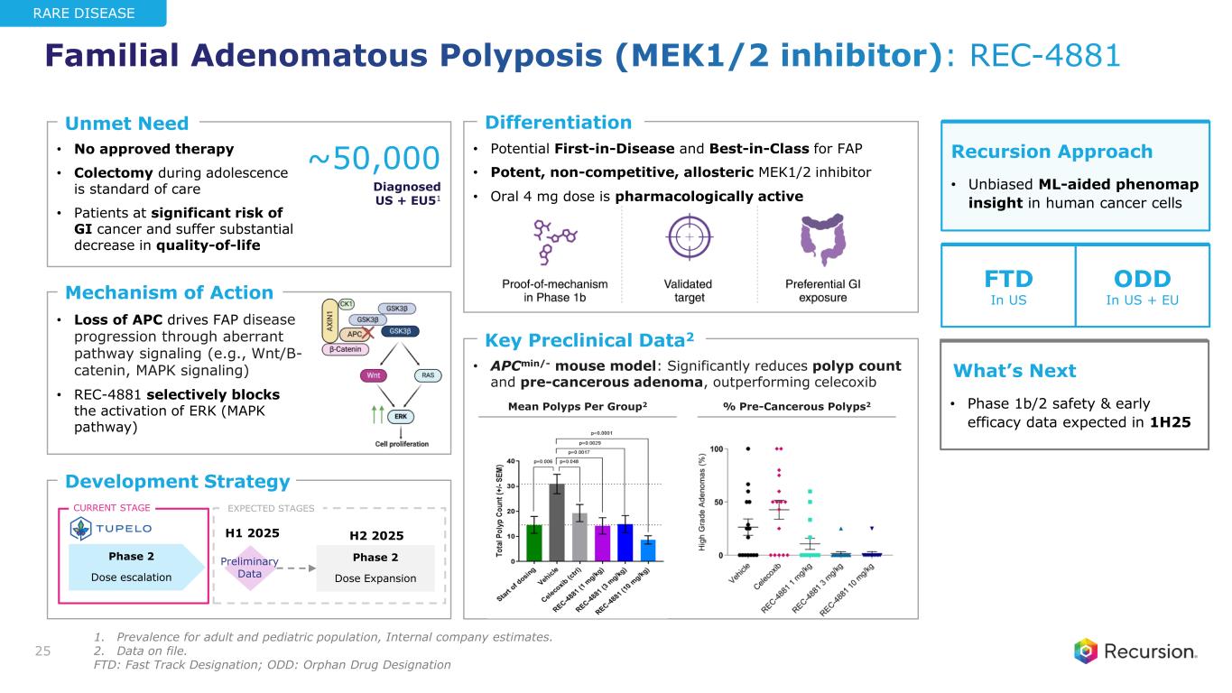 • Reduces lesion number & size in preclinical models • Phase 2 primary endpoint of safety and tolerability met • REC-994 400 mg improved clinical function (mRS) in in CCM patients, including those with brainstem lesions • No approved therapy • Surgical resection or stereotactic radiosurgery is non curative and not always feasible because of location • Potential First-in-Disease oral therapeutic for CCM • No TEAEs leading to discontinuation up to 800 mg in Ph 13 • Selective, orally bioavailable redox-cycling nitroxide • Promotes the metabolism of ROS to reduce oxidative stress within cells • Stabilizes endothelial barrier function Mechanism of Action Unmet Need Differentiation Development Strategy ~360,000 Symptomatic US + EU51 Phase 2b/3 Contingent on FDA feedback Phase 2 LTE ongoing 24 Recursion Approach • Unbiased ML-aided phenotypic drug screen to identify effective therapeutics driving CCM What’s Next • LTE ongoing • Program updates expected in 2H25CURRENT STAGE FDA mtg EXPECTED STAGES H2 2025 80% Of Ph2 patients continued to LTE ODD In US + EU RARE DISEASE Key Data • Cerebral Cavernous Malformation (Superoxide Scavenger): REC-994 Baseline 12 months ~38% Reduction in baseline lesion volume in 39 yr old female diagnosed with sporadic CCM brainstem lesion 1. Prevalence for hereditary and sporadic symptomatic population; Internal company estimates. 2. Gibson et al, Circulation (2015) and Data on File. 3. Alfa et al, Pharmacol Res Perspect (2024). LTE: long-term extension; ODD: Orphan Drug Designation