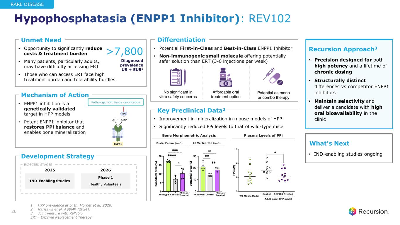 • Potential First-in-Class and Best-in-Class ENPP1 Inhibitor • Non-immunogenic small molecule offering potentially safer solution than ERT (3-6 injections per week) • Opportunity to significantly reduce costs & treatment burden • Many patients, particularly adults, may have difficulty accessing ERT • Those who can access ERT face high treatment burden and tolerability hurdles • Improvement in mineralization in mouse models of HPP • Significantly reduced PPi levels to that of wild-type mice • ENPP1 inhibition is a genetically validated target in HPP models • Potent ENPP1 inhibitor that restores PPi balance and enables bone mineralization Key Preclinical Data2 Mechanism of Action Unmet Need Differentiation Development Strategy >7,800 Diagnosed prevalence US + EU51 26 Recursion Approach3 • Precision designed for both high potency and a lifetime of chronic dosing • Structurally distinct differences vs competitor ENPP1 inhibitors • Maintain selectivity and deliver a candidate with high oral bioavailability in the clinic What’s Next • IND-enabling studies ongoing IND-Enabling Studies Phase 1 Healthy Volunteers 20262025 EXPECTED STAGES RARE DISEASE WT Mouse Model Adult-onset HPP model Bone Morphometric Analysis Pathologic soft tissue calcification REV101-TreatedControl L3 Vertebrate (n=5)Distal Femur (n=5) ControlWildtype REV101- TreatedControlWildtype REV101- Treated Plasma Levels of PPi Hypophosphatasia (ENPP1 Inhibitor): REV102 1. HPP prevalence at birth. Mornet et al, 2020. 2. Narisawa et al. ASBMR (2024). 3. Joint venture with Rallybio ERT= Enzyme Replacement Therapy