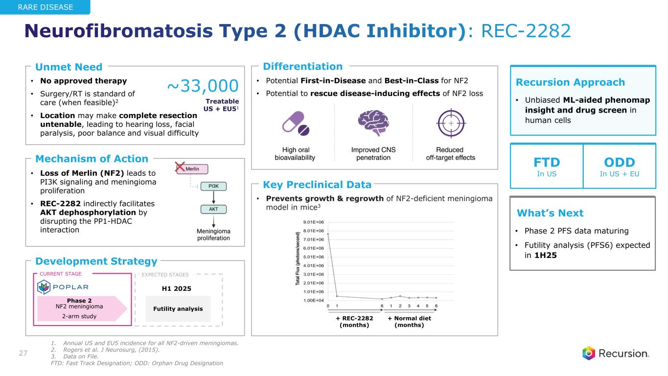 • No approved therapy • Surgery/RT is standard of care (when feasible)2 • Location may make complete resection untenable, leading to hearing loss, facial paralysis, poor balance and visual difficulty • Potential First-in-Disease and Best-in-Class for NF2 • Potential to rescue disease-inducing effects of NF2 loss • Prevents growth & regrowth of NF2-deficient meningioma model in mice3 • Loss of Merlin (NF2) leads to PI3K signaling and meningioma proliferation • REC-2282 indirectly facilitates AKT dephosphorylation by disrupting the PP1-HDAC interaction Key Preclinical Data Mechanism of Action Unmet Need Differentiation Development Strategy ~33,000 Treatable US + EU51 Phase 2 NF2 meningioma 2-arm study Futility analysis H1 2025 27 Recursion Approach • Unbiased ML-aided phenomap insight and drug screen in human cells What’s Next • Phase 2 PFS data maturing • Futility analysis (PFS6) expected in 1H25 CURRENT STAGE EXPECTED STAGES FTD In US ODD In US + EU RARE DISEASE + REC-2282 (months) + Normal diet (months) Neurofibromatosis Type 2 (HDAC Inhibitor): REC-2282 1. Annual US and EU5 incidence for all NF2-driven meningiomas. 2. Rogers et al. J Neurosurg, (2015). 3. Data on File. FTD: Fast Track Designation; ODD: Orphan Drug Designation