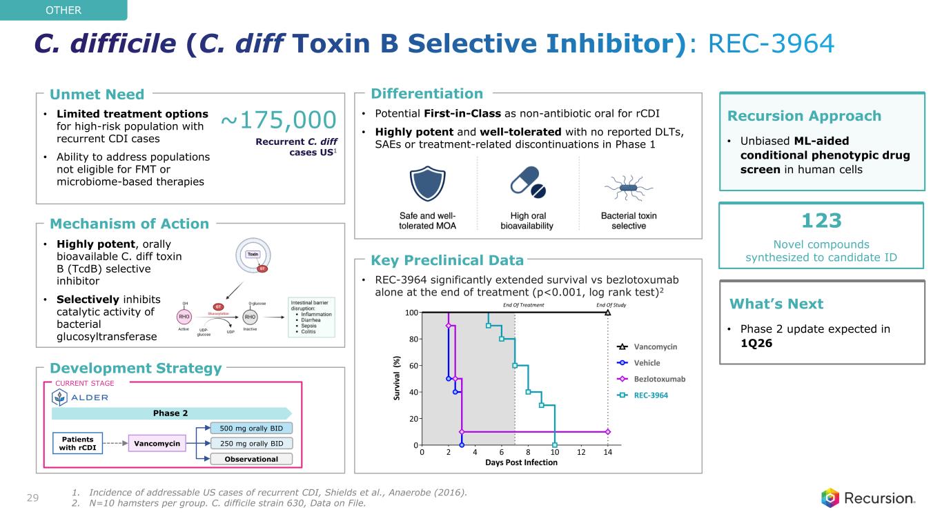 • Limited treatment options for high-risk population with recurrent CDI cases • Ability to address populations not eligible for FMT or microbiome-based therapies • Potential First-in-Class as non-antibiotic oral for rCDI • Highly potent and well-tolerated with no reported DLTs, SAEs or treatment-related discontinuations in Phase 1 • REC-3964 significantly extended survival vs bezlotoxumab alone at the end of treatment (p<0.001, log rank test)2 • Highly potent, orally bioavailable C. diff toxin B (TcdB) selective inhibitor • Selectively inhibits catalytic activity of bacterial glucosyltransferase Key Preclinical Data Mechanism of Action Unmet Need Differentiation Development Strategy ~175,000 Recurrent C. diff cases US1 29 Recursion Approach • Unbiased ML-aided conditional phenotypic drug screen in human cells What’s Next • Phase 2 update expected in 1Q26 Phase 2 CURRENT STAGE 250 mg orally BID 500 mg orally BID Observational Patients with rCDI Vancomycin 123 Novel compounds synthesized to candidate ID OTHER C. difficile (C. diff Toxin B Selective Inhibitor): REC-3964 1. Incidence of addressable US cases of recurrent CDI, Shields et al., Anaerobe (2016). 2. N=10 hamsters per group. C. difficile strain 630, Data on File.