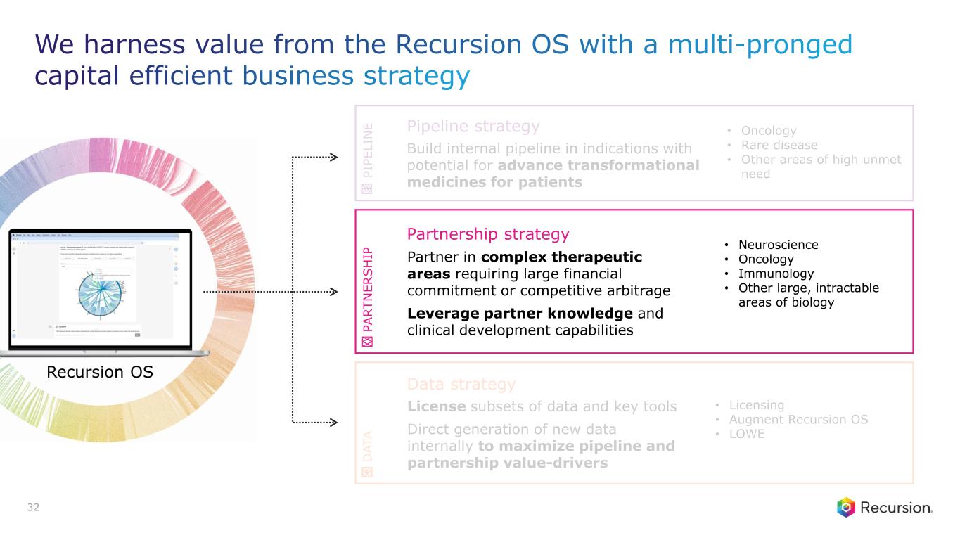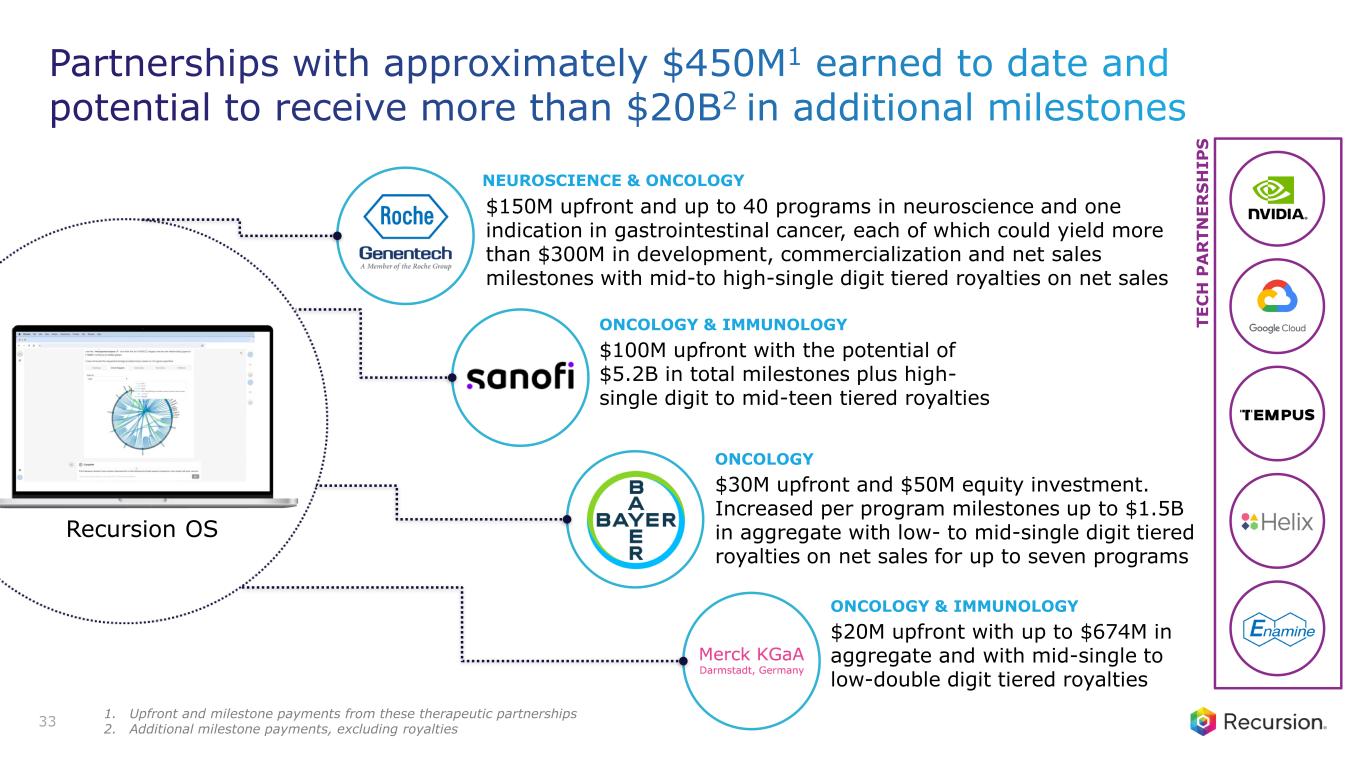 Build internal pipeline in indications with potential for advance transformational medicines for patients Pipeline strategy • Oncology • Rare disease • Other areas of high unmet need Partnership strategy Partner in complex therapeutic areas requiring large financial commitment or competitive arbitrage Leverage partner knowledge and clinical development capabilities • Neuroscience • Oncology • Immunology • Other large, intractable areas of biology License subsets of data and key tools Direct generation of new data internally to maximize pipeline and partnership value-drivers Data strategy • Licensing • Augment Recursion OS • LOWE P IP E L IN E P A R T N E R S H IP D A T A 32 Recursion OS We harness value from the Recursion OS with a multi-pronged capital efficient business strategy