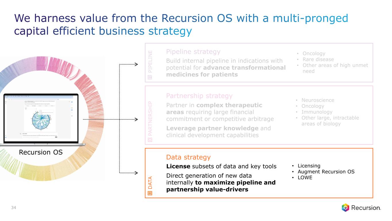 T E C H P A R T N E R S H I P S $20M upfront with up to $674M in aggregate and with mid-single to low-double digit tiered royalties ONCOLOGY & IMMUNOLOGY $30M upfront and $50M equity investment. Increased per program milestones up to $1.5B in aggregate with low- to mid-single digit tiered royalties on net sales for up to seven programs ONCOLOGY $100M upfront with the potential of $5.2B in total milestones plus high- single digit to mid-teen tiered royalties ONCOLOGY & IMMUNOLOGY $150M upfront and up to 40 programs in neuroscience and one indication in gastrointestinal cancer, each of which could yield more than $300M in development, commercialization and net sales milestones with mid-to high-single digit tiered royalties on net sales NEUROSCIENCE & ONCOLOGY 33 Recursion OS Partnerships with approximately $450M1 earned to date and potential to receive more than $20B2 in additional milestones 1. Upfront and milestone payments from these therapeutic partnerships 2. Additional milestone payments, excluding royalties