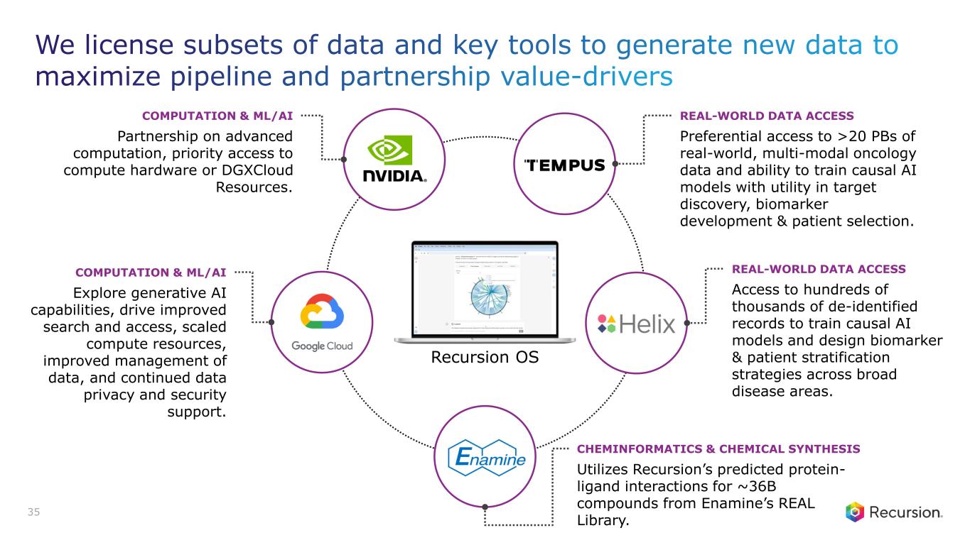 We harness value from the Recursion OS with a multi-pronged capital efficient business strategy Build internal pipeline in indications with potential for advance transformational medicines for patients Pipeline strategy • Oncology • Rare disease • Other areas of high unmet need Partnership strategy Partner in complex therapeutic areas requiring large financial commitment or competitive arbitrage Leverage partner knowledge and clinical development capabilities • Neuroscience • Oncology • Immunology • Other large, intractable areas of biology License subsets of data and key tools Direct generation of new data internally to maximize pipeline and partnership value-drivers Data strategy • Licensing • Augment Recursion OS • LOWE P IP E L IN E P A R T N E R S H IP D A T A 34 Recursion OS
