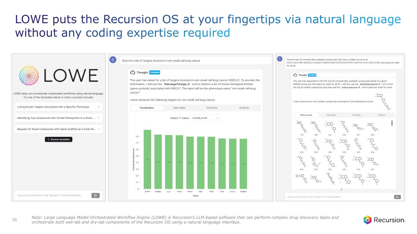 LOWE puts the Recursion OS at your fingertips via natural language without any coding expertise required 36 Note: Large Language Model-Orchestrated Workflow Engine (LOWE) is Recursion’s LLM-based software that can perform complex drug discovery tasks and orchestrate both wet-lab and dry-lab components of the Recursion OS using a natural language interface.
