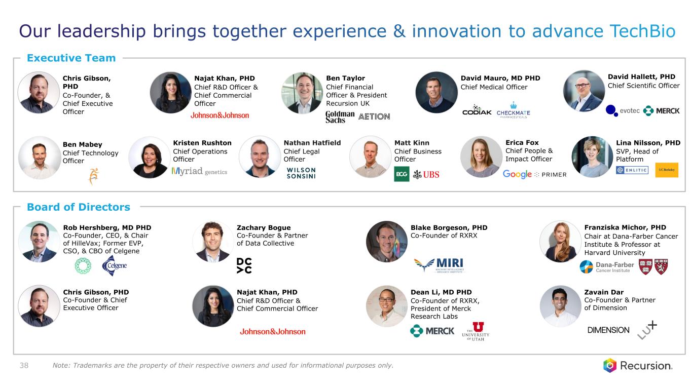 Board of Directors Dean Li, MD PHD Co-Founder of RXRX, President of Merck Research Labs Zavain Dar Co-Founder & Partner of Dimension Rob Hershberg, MD PHD Co-Founder, CEO, & Chair of HilleVax; Former EVP, CSO, & CBO of Celgene Zachary Bogue Co-Founder & Partner of Data Collective Najat Khan, PHD Chief R&D Officer & Chief Commercial Officer Franziska Michor, PHD Chair at Dana-Farber Cancer Institute & Professor at Harvard University Executive Team Ben Mabey Chief Technology Officer Kristen Rushton Chief Operations Officer Ben Taylor Chief Financial Officer & President Recursion UK Nathan Hatfield Chief Legal Officer David Mauro, MD PHD Chief Medical Officer Matt Kinn Chief Business Officer Najat Khan, PHD Chief R&D Officer & Chief Commercial Officer Erica Fox Chief People & Impact Officer David Hallett, PHD Chief Scientific Officer Lina Nilsson, PHD SVP, Head of Platform Blake Borgeson, PHD Co-Founder of RXRX 38 Chris Gibson, PHD Co-Founder, & Chief Executive Officer Chris Gibson, PHD Co-Founder & Chief Executive Officer Our leadership brings together experience & innovation to advance TechBio Note: Trademarks are the property of their respective owners and used for informational purposes only.