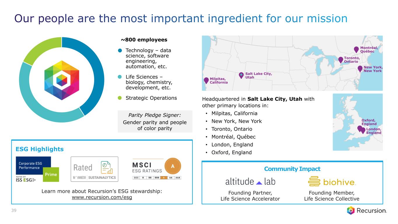 Parity Pledge Signer: Gender parity and people of color parity Technology – data science, software engineering, automation, etc. Life Sciences – biology, chemistry, development, etc. Strategic Operations ~800 employees Community Impact Founding Partner, Life Science Accelerator Founding Member, Life Science Collective ESG Highlights Learn more about Recursion’s ESG stewardship: www.recursion.com/esg Milpitas, California Salt Lake City, Utah Toronto, Ontario Montréal, Québec London, England Oxford, England New York, New York Headquartered in Salt Lake City, Utah with other primary locations in: • Milpitas, California • New York, New York • Toronto, Ontario • Montréal, Québec • London, England • Oxford, England 39 Our people are the most important ingredient for our mission