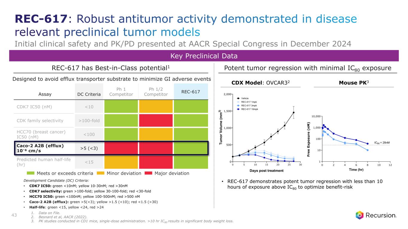 Program Status • Potential Best-in-Class and First-in-Class CDK7 inhibitor • Phase 1/2 study in advanced solid tumors ongoing • Initial Phase 1 monotherapy safety, PK/PD update presented at AACR Special Conference in Cancer Research held on December 9, 2024 Mechanism of Action • Reversible CDK7 inhibitor that targets both cell cycle progression and transcriptional regulation Thesis & Differentiation • Non-covalent binding and improved selectivity to decrease off- target toxicity • 8-10 hours of therapeutic coverage at IC80 with a short half-life to reduce on-target toxicity • Rapid absorption and permeability at lowest possible dose Unmet Need1 • Multiple cancer indications that have the potential to address ~185,000 patients annually • R/R solid tumors including breast, NSCLC, ovarian, pancreatic, colorectal, and head & neck 42 Recursion Approach • AI-powered precision design to optimize PK/PD to maximize potential therapeutic index • 136 novel compounds synthesized to candidate ID REC-617: CDK7 Inhibitor A precision designed highly selective CDK7 inhibitor for Relapsed and/or Refractory (R/R) Solid Tumors 1. Advanced solid tumors including breast, NSCLC, ovarian, pancreatic, colorectal and head & neck. US and EU5 treatable incidence, 2022.