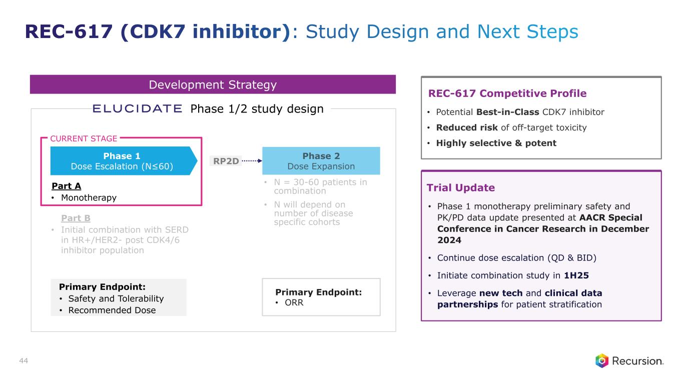 Assay DC Criteria Ph 1 Competitor Ph 1/2 Competitor REC-617 CDK7 IC50 (nM) <10 CDK family selectivity >100-fold HCC70 (breast cancer) IC50 (nM) <100 Caco-2 A2B (efflux) 10⁻⁶ cm/s >5 (<3) Predicted human half-life (hr) <15 Potent tumor regression with minimal IC80 exposureREC-617 has Best-in-Class potential1 Designed to avoid efflux transporter substrate to minimize GI adverse events Key Preclinical Data 43 Meets or exceeds criteria Minor deviation Major deviation Development Candidate (DC) Criteria: • CDK7 IC50: green <10nM; yellow 10-30nM; red >30nM • CDK7 selectivity: green >100-fold; yellow 30-100-fold; red <30-fold • HCC70 IC50: green <100nM; yellow 100-500nM; red >500 nM • Caco-2 A2B (efflux): green >5(<3); yellow >1.5 (<10); red <1.5 (>30) • Half-life: green <15, yellow <24, red >24 • REC-617 demonstrates potent tumor regression with less than 10 hours of exposure above IC80 to optimize benefit-risk CDX Model: OVCAR32 Mouse PK3 REC-617: Robust antitumor activity demonstrated in disease relevant preclinical tumor models Initial clinical safety and PK/PD presented at AACR Special Congress in December 2024 1. Data on File. 2. Besnard et al, AACR (2022). 3. PK studies conducted in CD1 mice, single-dose administration. >10 hr IC80 results in significant body weight loss.