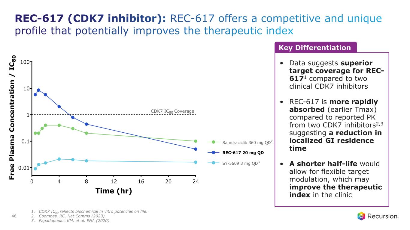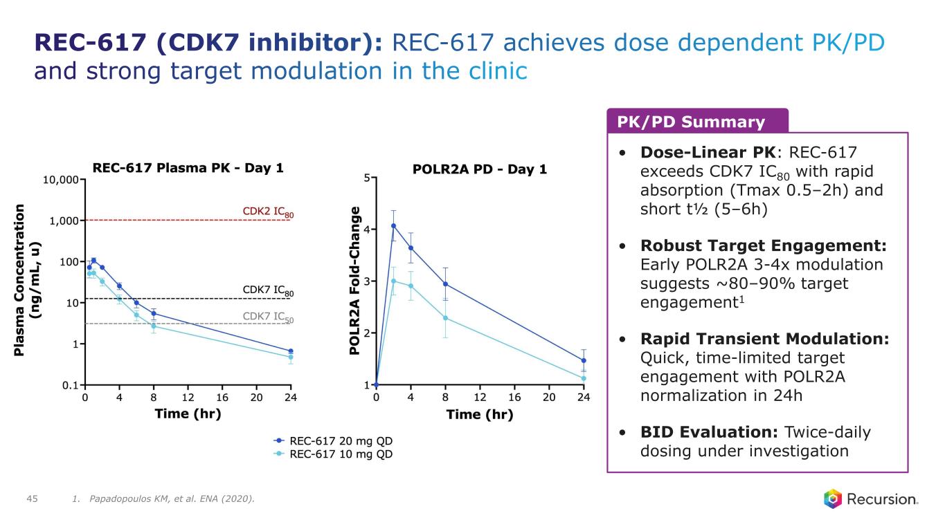 Development Strategy Part A • Monotherapy Part B • Initial combination with SERD in HR+/HER2- post CDK4/6 inhibitor population • N = 30-60 patients in combination • N will depend on number of disease specific cohorts Primary Endpoint: • Safety and Tolerability • Recommended Dose RP2D Phase 1 Dose Escalation (N≤60) Phase 1/2 study design CURRENT STAGE Primary Endpoint: • ORR 44 Trial Update • Phase 1 monotherapy preliminary safety and PK/PD data update presented at AACR Special Conference in Cancer Research in December 2024 • Continue dose escalation (QD & BID) • Initiate combination study in 1H25 • Leverage new tech and clinical data partnerships for patient stratification REC-617 Competitive Profile • Potential Best-in-Class CDK7 inhibitor • Reduced risk of off-target toxicity • Highly selective & potent REC-617 (CDK7 inhibitor): Study Design and Next Steps