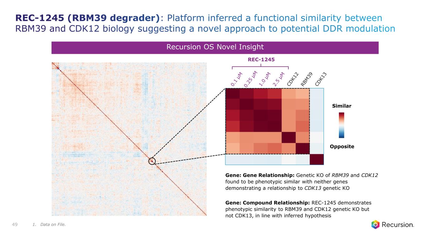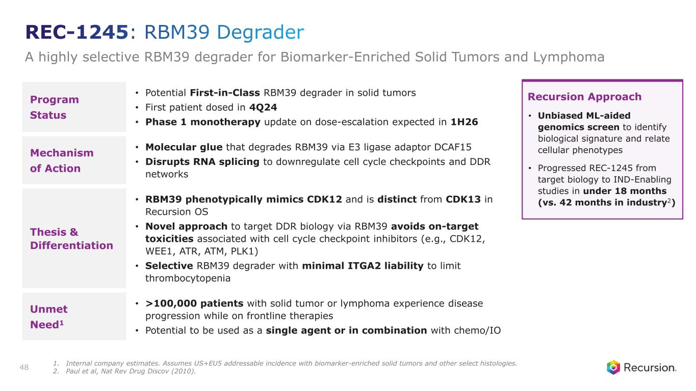 Program Status • Potential First-in-Class RBM39 degrader in solid tumors • First patient dosed in 4Q24 • Phase 1 monotherapy update on dose-escalation expected in 1H26 Mechanism of Action • Molecular glue that degrades RBM39 via E3 ligase adaptor DCAF15 • Disrupts RNA splicing to downregulate cell cycle checkpoints and DDR networks Thesis & Differentiation • RBM39 phenotypically mimics CDK12 and is distinct from CDK13 in Recursion OS • Novel approach to target DDR biology via RBM39 avoids on-target toxicities associated with cell cycle checkpoint inhibitors (e.g., CDK12, WEE1, ATR, ATM, PLK1) • Selective RBM39 degrader with minimal ITGA2 liability to limit thrombocytopenia Unmet Need1 • >100,000 patients with solid tumor or lymphoma experience disease progression while on frontline therapies • Potential to be used as a single agent or in combination with chemo/IO 48 Recursion Approach • Unbiased ML-aided genomics screen to identify biological signature and relate cellular phenotypes • Progressed REC-1245 from target biology to IND-Enabling studies in under 18 months (vs. 42 months in industry2) REC-1245: RBM39 Degrader A highly selective RBM39 degrader for Biomarker-Enriched Solid Tumors and Lymphoma 1. Internal company estimates. Assumes US+EU5 addressable incidence with biomarker-enriched solid tumors and other select histologies. 2. Paul et al, Nat Rev Drug Discov (2010).