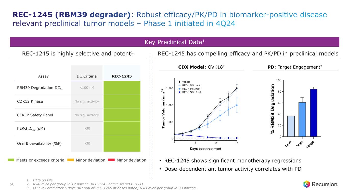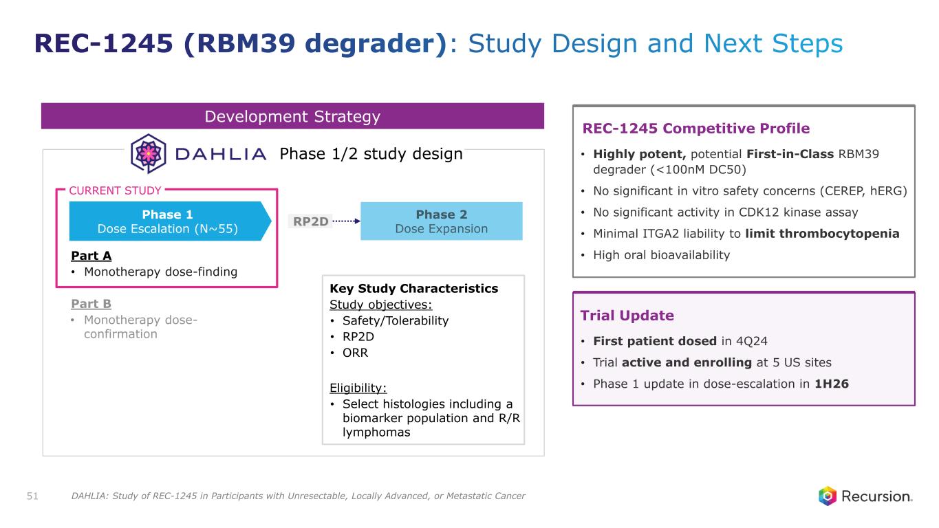 Key Preclinical Data1 REC-1245 is highly selective and potent1 Assay DC Criteria REC-1245 RBM39 Degradation DC50 <100 nM CDK12 Kinase No sig. activity CEREP Safety Panel No sig. activity hERG IC50 (µM) >30 Oral Bioavailability (%F) >30 REC-1245 has compelling efficacy and PK/PD in preclinical models 50 Meets or exceeds criteria Minor deviation Major deviation • REC-1245 shows significant monotherapy regressions • Dose-dependent antitumor activity correlates with PD CDX Model: OVK182 PD: Target Engagement3 REC-1245 (RBM39 degrader): Robust efficacy/PK/PD in biomarker-positive disease relevant preclinical tumor models – Phase 1 initiated in 4Q24 1. Data on File. 2. N=8 mice per group in TV portion. REC-1245 administered BID PO. 3. PD evaluated after 5 days BID oral of REC-1245 at doses noted; N=3 mice per group in PD portion.