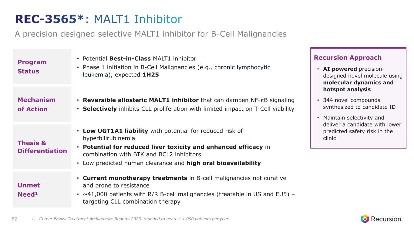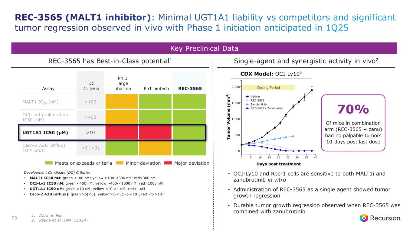 Program Status • Potential Best-in-Class MALT1 inhibitor • Phase 1 initiation in B-Cell Malignancies (e.g., chronic lymphocytic leukemia), expected 1H25 Mechanism of Action • Reversible allosteric MALT1 inhibitor that can dampen NF-κB signaling • Selectively inhibits CLL proliferation with limited impact on T-Cell viability Thesis & Differentiation • Low UGT1A1 liability with potential for reduced risk of hyperbilirubinemia • Potential for reduced liver toxicity and enhanced efficacy in combination with BTK and BCL2 inhibitors • Low predicted human clearance and high oral bioavailability Unmet Need1 • Current monotherapy treatments in B-cell malignancies not curative and prone to resistance • ~41,000 patients with R/R B-cell malignancies (treatable in US and EU5) – targeting CLL combination therapy 52 Recursion Approach • AI powered precision- designed novel molecule using molecular dynamics and hotspot analysis • 344 novel compounds synthesized to candidate ID • Maintain selectivity and deliver a candidate with lower predicted safety risk in the clinic REC-3565*: MALT1 Inhibitor A precision designed selective MALT1 inhibitor for B-Cell Malignancies 1. Cerner Enviza Treatment Architecture Reports 2023, rounded to nearest 1,000 patients per year.