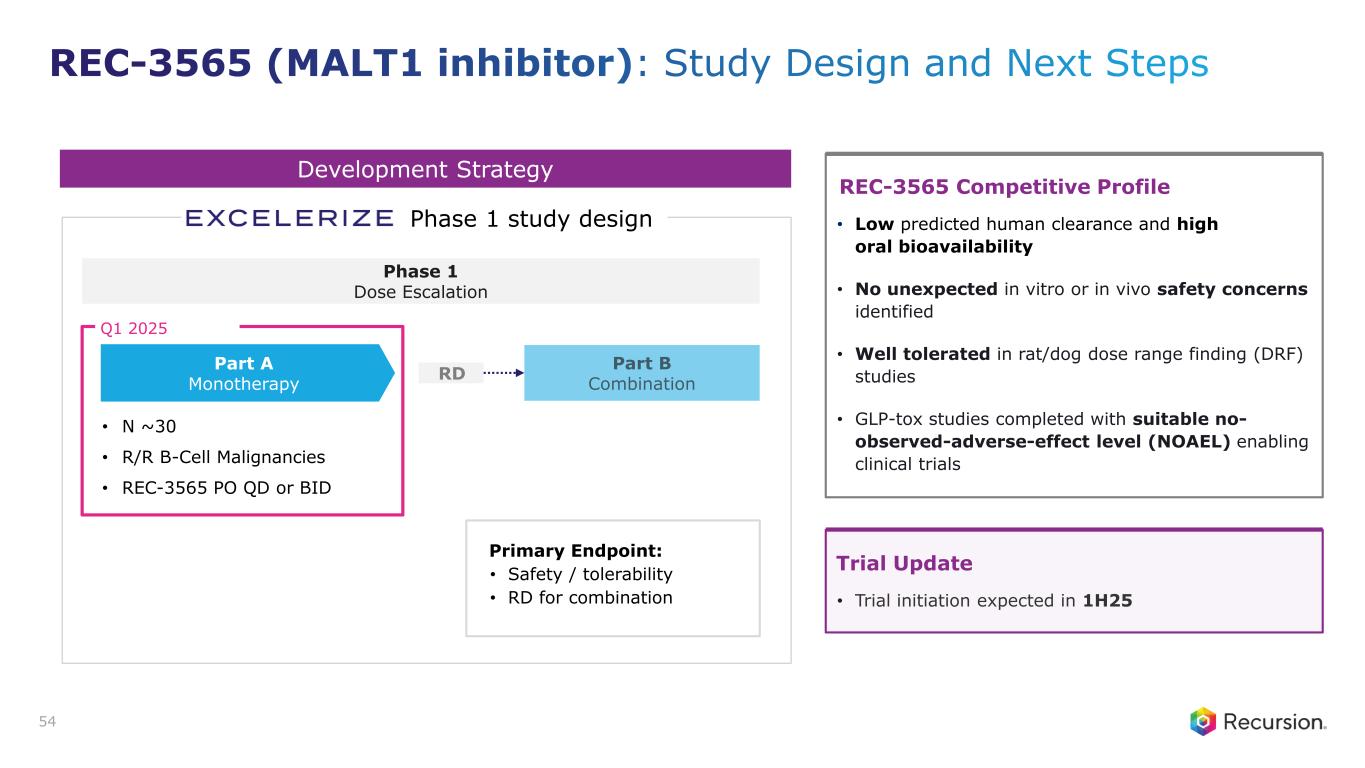 Key Preclinical Data Assay DC Criteria Ph 1 large pharma Ph1 biotech REC-3565 MALT1 IC50 (nM) <100 OCI-Ly3 proliferation IC50 (nM) <400 UGT1A1 IC50 (µM) >10 Caco-2 A2B (efflux) 10⁻⁶ cm/s >5 (<3) REC-3565 has Best-in-Class potential1 Single-agent and synergistic activity in vivo2 • OCI-Ly10 and Rec-1 cells are sensitive to both MALT1i and zanubrutinib in vitro • Administration of REC-3565 as a single agent showed tumor growth regression • Durable tumor growth regression observed when REC-3565 was combined with zanubrutinib Development Candidate (DC) Criteria: • MALT1 IC50 nM: green <100 nM; yellow >100-<300 nM; red>300 nM • OCI-Ly3 IC50 nM: green <400 nM; yellow >400-<1000 nM; red>1000 nM • UGT1A1 IC50 uM: green >10 uM; yellow <10->1 uM; red<1 uM • Caco-2 A2B (efflux): green >5(<3); yellow >1-<5(>3-<10); red <1(>10) 53 Meets or exceeds criteria Minor deviation Major deviation CDX Model: OCI-Ly102 70% Of mice in combination arm (REC-3565 + zanu) had no palpable tumors 10-days post last dose REC-3565 (MALT1 inhibitor): Minimal UGT1A1 liability vs competitors and significant tumor regression observed in vivo with Phase 1 initiation anticipated in 1Q25 1. Data on File. 2. Payne et al. ENA, (2024).