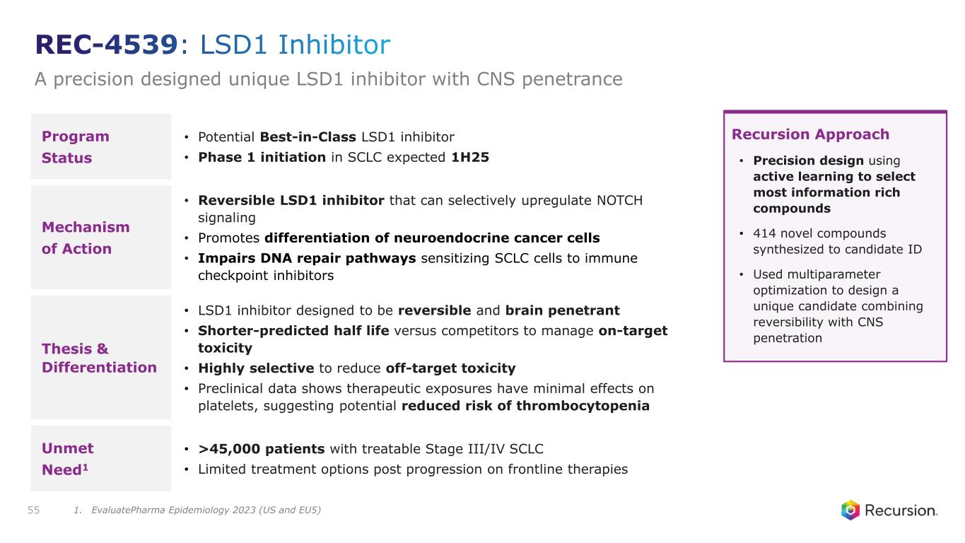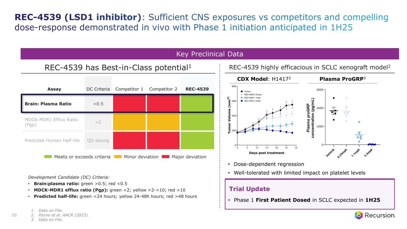 Program Status • Potential Best-in-Class LSD1 inhibitor • Phase 1 initiation in SCLC expected 1H25 Mechanism of Action • Reversible LSD1 inhibitor that can selectively upregulate NOTCH signaling • Promotes differentiation of neuroendocrine cancer cells • Impairs DNA repair pathways sensitizing SCLC cells to immune checkpoint inhibitors Thesis & Differentiation • LSD1 inhibitor designed to be reversible and brain penetrant • Shorter-predicted half life versus competitors to manage on-target toxicity • Highly selective to reduce off-target toxicity • Preclinical data shows therapeutic exposures have minimal effects on platelets, suggesting potential reduced risk of thrombocytopenia Unmet Need1 • >45,000 patients with treatable Stage III/IV SCLC • Limited treatment options post progression on frontline therapies 55 Recursion Approach • Precision design using active learning to select most information rich compounds • 414 novel compounds synthesized to candidate ID • Used multiparameter optimization to design a unique candidate combining reversibility with CNS penetration REC-4539: LSD1 Inhibitor A precision designed unique LSD1 inhibitor with CNS penetrance 1. EvaluatePharma Epidemiology 2023 (US and EU5)