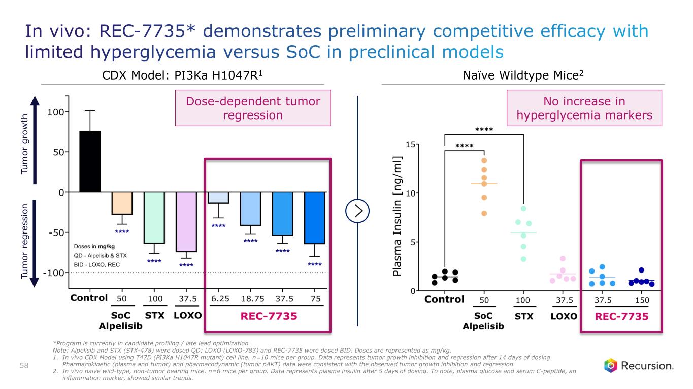 REC-7735 (PI3Kα H1047R): An AI-designed, highly selective H1047R- targeting PI3K inhibitor designed to enhance therapeutic index* 57 Our Approach: AI-powered precision design using automated synthesis and generative molecular design intended to mitigate adverse events seen in class • >100-fold better selectivity against WT PI3Kα, 10x-fold better selectivity vs. other WT sparing inhibitors • Limited hyperglycemia observed in vivo at highest doses (vs. STX-478) • In vivo efficacy superior to SoC (alpelisib) and comparable to STX-478 • CNS penetrant with low- risk of dose-limiting AEs Recursion OS: REC-7735 Discovery PI3Kα H1047R *Program is currently in candidate profiling / late lead optimization