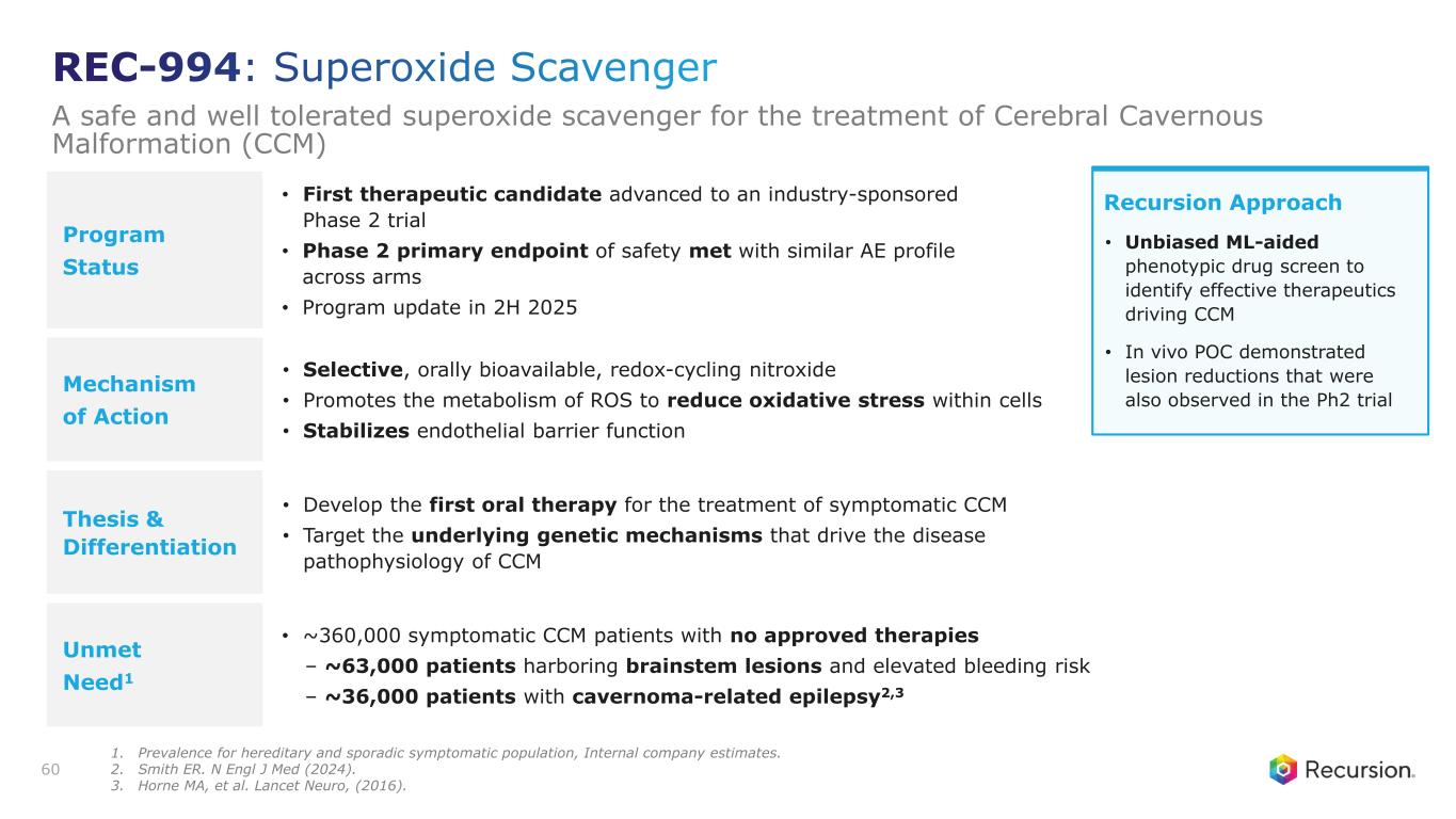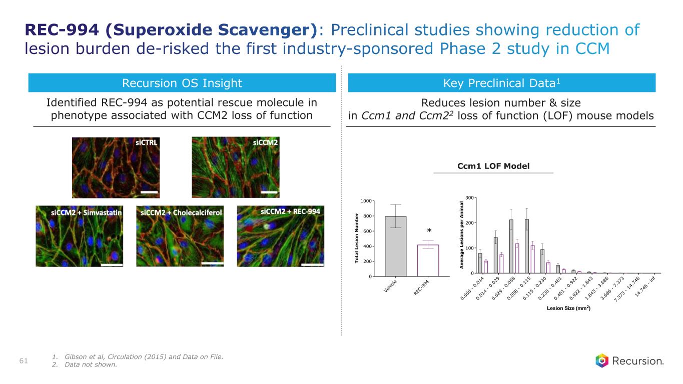 Program Status • First therapeutic candidate advanced to an industry-sponsored Phase 2 trial • Phase 2 primary endpoint of safety met with similar AE profile across arms • Program update in 2H 2025 Mechanism of Action • Selective, orally bioavailable, redox-cycling nitroxide • Promotes the metabolism of ROS to reduce oxidative stress within cells • Stabilizes endothelial barrier function Thesis & Differentiation • Develop the first oral therapy for the treatment of symptomatic CCM • Target the underlying genetic mechanisms that drive the disease pathophysiology of CCM Unmet Need1 • ~360,000 symptomatic CCM patients with no approved therapies – ~63,000 patients harboring brainstem lesions and elevated bleeding risk – ~36,000 patients with cavernoma-related epilepsy2,3 60 Recursion Approach • Unbiased ML-aided phenotypic drug screen to identify effective therapeutics driving CCM • In vivo POC demonstrated lesion reductions that were also observed in the Ph2 trial REC-994: Superoxide Scavenger A safe and well tolerated superoxide scavenger for the treatment of Cerebral Cavernous Malformation (CCM) 1. Prevalence for hereditary and sporadic symptomatic population, Internal company estimates. 2. Smith ER. N Engl J Med (2024). 3. Horne MA, et al. Lancet Neuro, (2016).