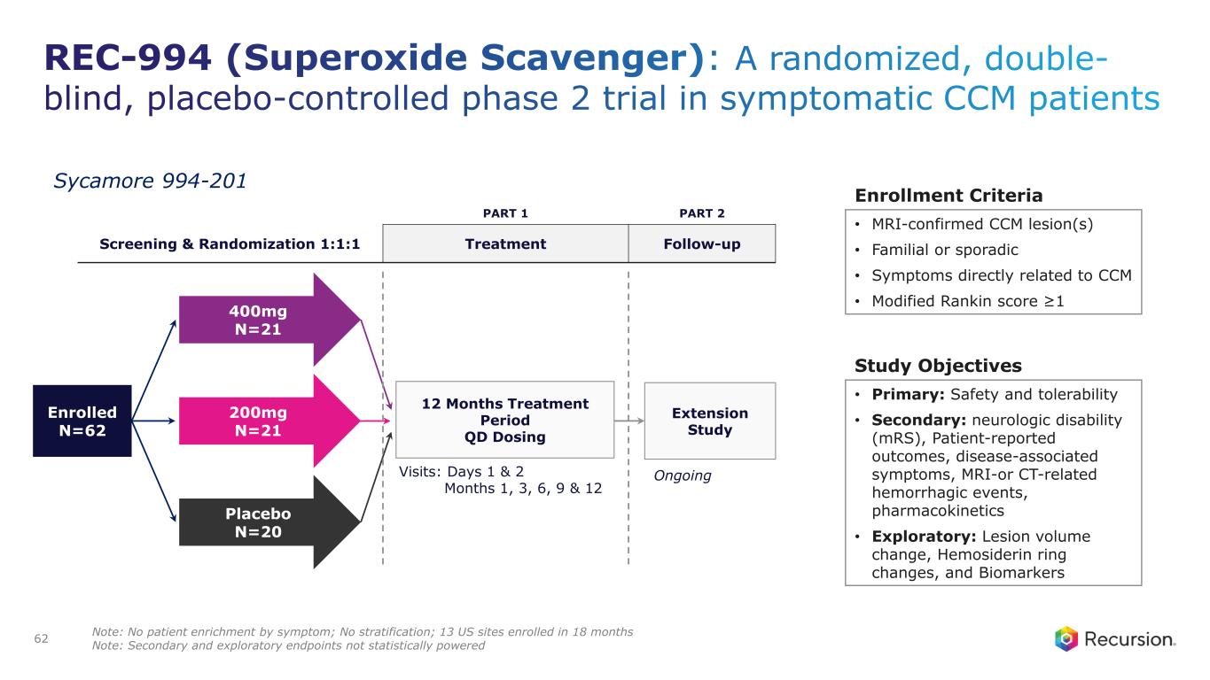 Key Preclinical Data1 Reduces lesion number & size in Ccm1 and Ccm22 loss of function (LOF) mouse models Identified REC-994 as potential rescue molecule in phenotype associated with CCM2 loss of function Recursion OS Insight 61 Ccm1 LOF Model REC-994 (Superoxide Scavenger): Preclinical studies showing reduction of lesion burden de-risked the first industry-sponsored Phase 2 study in CCM Ve hi cl e R EC -9 94 0 200 400 600 800 1000 T o ta l L e s io n N u m b e r * Vehicle REC-994 0. 00 0 - 0. 01 4 0. 01 4 - 0. 02 9 0. 02 9 - 0. 05 8 0. 05 8 - 0. 11 5 0. 11 5 - 0. 23 0 0. 23 0 - 0. 46 1 0. 46 1 - 0. 92 2 0. 92 2 - 1. 84 3 1. 84 3 - 3. 68 6 3. 68 6 - 7. 37 3 7. 37 3 - 14 .7 46 14 .7 46 - in f 0 100 200 300 Lesion Size (mm2) A v e ra g e L e s io n s p e r A n im a l Ve hi cl e R EC -9 94 0 200 400 600 800 1000 T o ta l L e s io n N u m b e r * Vehicle REC-994 0. 00 0 - 0. 01 4 0. 01 4 - 0. 02 9 0. 02 9 - 0. 05 8 0. 05 8 - 0. 11 5 0. 11 5 - 0. 23 0 0. 23 0 - 0. 46 1 0. 46 1 - 0. 92 2 0. 92 2 - 1. 84 3 1. 84 3 - 3. 68 6 3. 68 6 - 7. 37 3 7. 37 3 - 14 .7 46 14 .7 46 - in f 0 100 200 300 Lesion Size (mm2) A v e ra g e L e s io n s p e r A n im a l 1. Gibson et al, Circulation (2015) and Data on File. 2. Data not shown.
