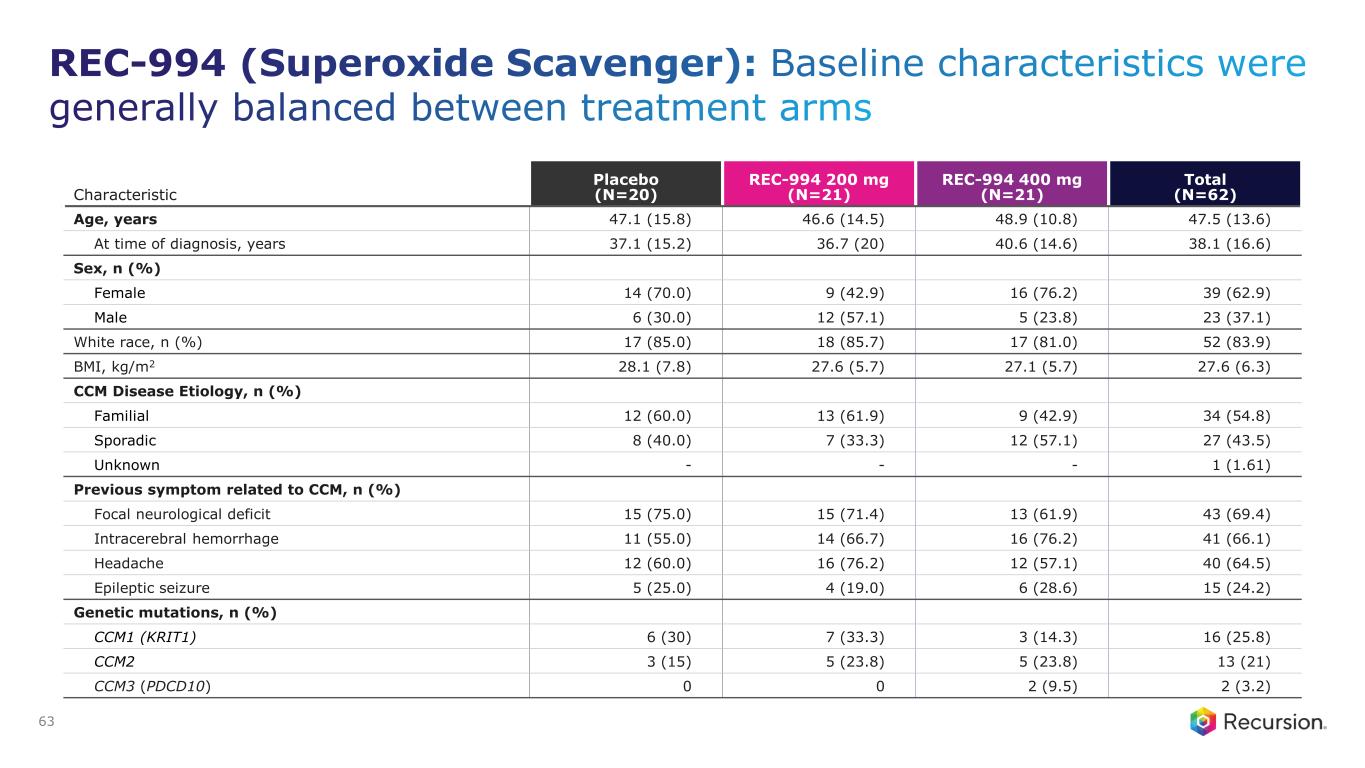 REC-994 (Superoxide Scavenger): A randomized, double- blind, placebo-controlled phase 2 trial in symptomatic CCM patients 62 PART 1 PART 2 Screening & Randomization 1:1:1 Treatment Follow-up Trial Update 400mg N=21 200mg N=21 Placebo N=20 Visits: Days 1 & 2 Months 1, 3, 6, 9 & 12 Enrolled N=62 Extension Study 12 Months Treatment Period QD Dosing Ongoing Enrollment Criteria • MRI-confirmed CCM lesion(s) • Familial or sporadic • Symptoms directly related to CCM • Modified Rankin score ≥1 Study Objectives • Primary: Safety and tolerability • Secondary: neurologic disability (mRS), Patient-reported outcomes, disease-associated symptoms, MRI-or CT-related hemorrhagic events, pharmacokinetics • Exploratory: Lesion volume change, Hemosiderin ring changes, and Biomarkers Sycamore 994-201 Note: No patient enrichment by symptom; No stratification; 13 US sites enrolled in 18 months Note: Secondary and exploratory endpoints not statistically powered