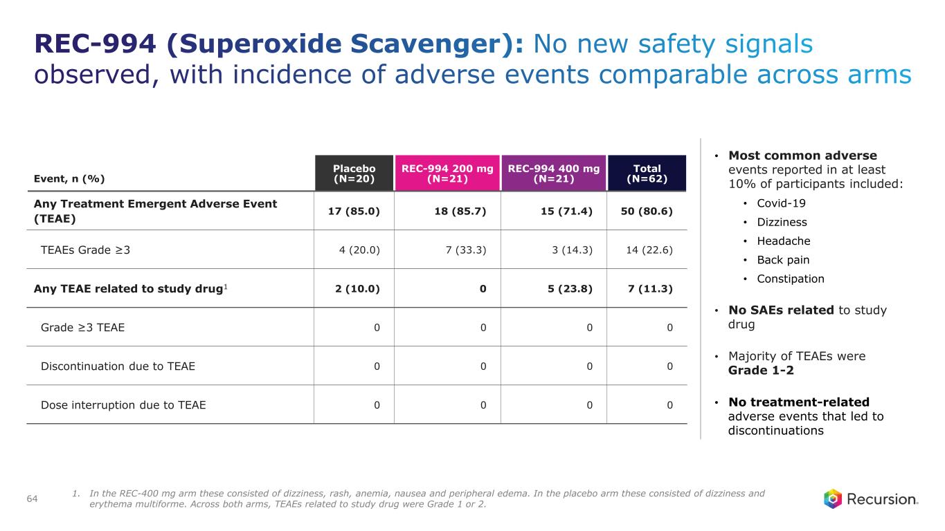 REC-994 (Superoxide Scavenger): Baseline characteristics were generally balanced between treatment arms 63 Characteristic Placebo (N=20) REC-994 200 mg (N=21) REC-994 400 mg (N=21) Total (N=62) Age, years 47.1 (15.8) 46.6 (14.5) 48.9 (10.8) 47.5 (13.6) At time of diagnosis, years 37.1 (15.2) 36.7 (20) 40.6 (14.6) 38.1 (16.6) Sex, n (%) Female 14 (70.0) 9 (42.9) 16 (76.2) 39 (62.9) Male 6 (30.0) 12 (57.1) 5 (23.8) 23 (37.1) White race, n (%) 17 (85.0) 18 (85.7) 17 (81.0) 52 (83.9) BMI, kg/m2 28.1 (7.8) 27.6 (5.7) 27.1 (5.7) 27.6 (6.3) CCM Disease Etiology, n (%) Familial 12 (60.0) 13 (61.9) 9 (42.9) 34 (54.8) Sporadic 8 (40.0) 7 (33.3) 12 (57.1) 27 (43.5) Unknown - - - 1 (1.61) Previous symptom related to CCM, n (%) Focal neurological deficit 15 (75.0) 15 (71.4) 13 (61.9) 43 (69.4) Intracerebral hemorrhage 11 (55.0) 14 (66.7) 16 (76.2) 41 (66.1) Headache 12 (60.0) 16 (76.2) 12 (57.1) 40 (64.5) Epileptic seizure 5 (25.0) 4 (19.0) 6 (28.6) 15 (24.2) Genetic mutations, n (%) CCM1 (KRIT1) 6 (30) 7 (33.3) 3 (14.3) 16 (25.8) CCM2 3 (15) 5 (23.8) 5 (23.8) 13 (21) CCM3 (PDCD10) 0 0 2 (9.5) 2 (3.2)