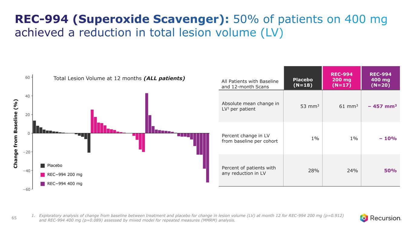 REC-994 (Superoxide Scavenger): No new safety signals observed, with incidence of adverse events comparable across arms 64 Event, n (%) Placebo (N=20) REC-994 200 mg (N=21) REC-994 400 mg (N=21) Total (N=62) Any Treatment Emergent Adverse Event (TEAE) 17 (85.0) 18 (85.7) 15 (71.4) 50 (80.6) TEAEs Grade ≥3 4 (20.0) 7 (33.3) 3 (14.3) 14 (22.6) Any TEAE related to study drug1 2 (10.0) 0 5 (23.8) 7 (11.3) Grade ≥3 TEAE 0 0 0 0 Discontinuation due to TEAE 0 0 0 0 Dose interruption due to TEAE 0 0 0 0 • Most common adverse events reported in at least 10% of participants included: • Covid-19 • Dizziness • Headache • Back pain • Constipation • No SAEs related to study drug • Majority of TEAEs were Grade 1-2 • No treatment-related adverse events that led to discontinuations 1. In the REC-400 mg arm these consisted of dizziness, rash, anemia, nausea and peripheral edema. In the placebo arm these consisted of dizziness and erythema multiforme. Across both arms, TEAEs related to study drug were Grade 1 or 2.