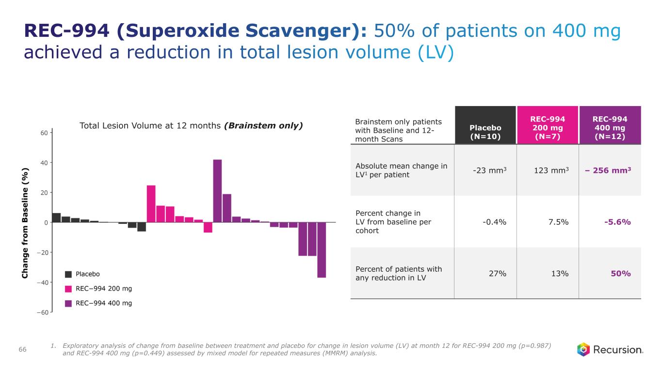REC-994 (Superoxide Scavenger): 50% of patients on 400 mg achieved a reduction in total lesion volume (LV) 65 All Patients with Baseline and 12-month Scans Placebo (N=18) REC-994 200 mg (N=17) REC-994 400 mg (N=20) Absolute mean change in LV1 per patient 53 mm3 61 mm3 – 457 mm3 Percent change in LV from baseline per cohort 1% 1% – 10% Percent of patients with any reduction in LV 28% 24% 50% Total Lesion Volume at 12 months (ALL patients) 1. Exploratory analysis of change from baseline between treatment and placebo for change in lesion volume (LV) at month 12 for REC-994 200 mg (p=0.912) and REC-994 400 mg (p=0.089) assessed by mixed model for repeated measures (MMRM) analysis.