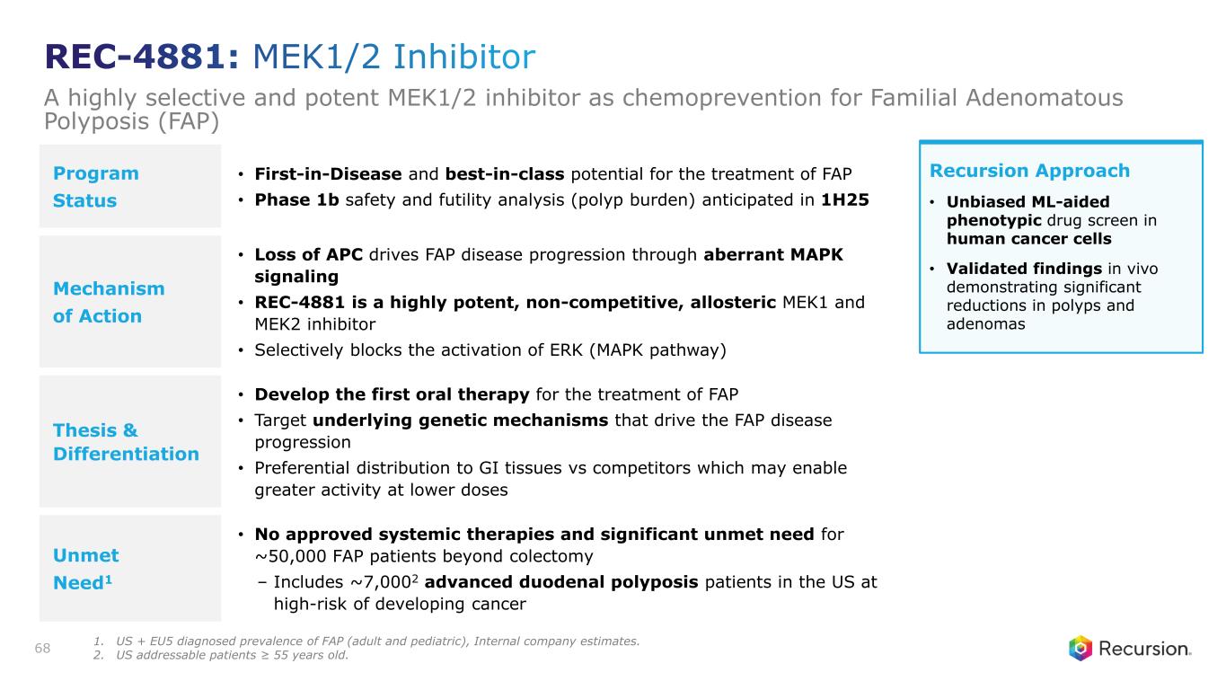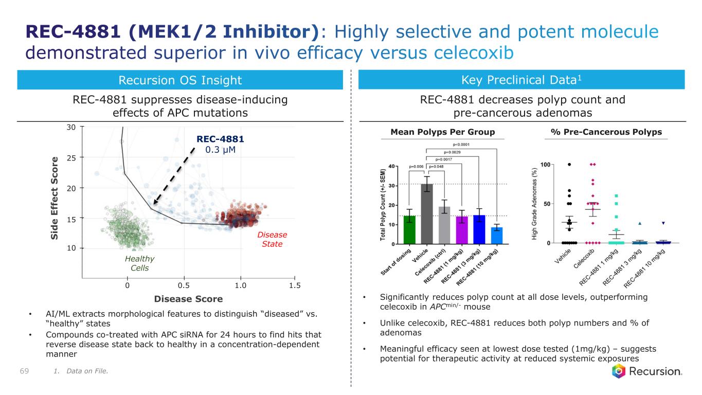 Program Status • First-in-Disease and best-in-class potential for the treatment of FAP • Phase 1b safety and futility analysis (polyp burden) anticipated in 1H25 Mechanism of Action • Loss of APC drives FAP disease progression through aberrant MAPK signaling • REC-4881 is a highly potent, non-competitive, allosteric MEK1 and MEK2 inhibitor • Selectively blocks the activation of ERK (MAPK pathway) Thesis & Differentiation • Develop the first oral therapy for the treatment of FAP • Target underlying genetic mechanisms that drive the FAP disease progression • Preferential distribution to GI tissues vs competitors which may enable greater activity at lower doses Unmet Need1 • No approved systemic therapies and significant unmet need for ~50,000 FAP patients beyond colectomy – Includes ~7,0002 advanced duodenal polyposis patients in the US at high-risk of developing cancer 68 Recursion Approach • Unbiased ML-aided phenotypic drug screen in human cancer cells • Validated findings in vivo demonstrating significant reductions in polyps and adenomas REC-4881: MEK1/2 Inhibitor A highly selective and potent MEK1/2 inhibitor as chemoprevention for Familial Adenomatous Polyposis (FAP) 1. US + EU5 diagnosed prevalence of FAP (adult and pediatric), Internal company estimates. 2. US addressable patients ≥ 55 years old.