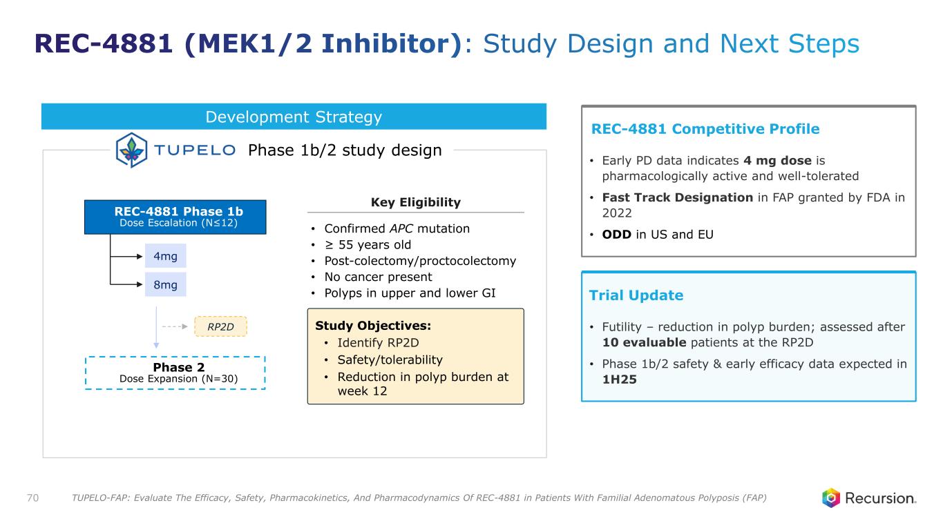 Key Preclinical Data1 REC-4881 decreases polyp count and pre-cancerous adenomas • Significantly reduces polyp count at all dose levels, outperforming celecoxib in APCmin/- mouse • Unlike celecoxib, REC-4881 reduces both polyp numbers and % of adenomas • Meaningful efficacy seen at lowest dose tested (1mg/kg) – suggests potential for therapeutic activity at reduced systemic exposures Recursion OS Insight S id e E ff e c t S c o r e 30 25 20 15 10 0 0.5 1.0 1.5 Disease Score REC-4881 0.3 µM Healthy Cells Disease State • AI/ML extracts morphological features to distinguish “diseased” vs. “healthy” states • Compounds co-treated with APC siRNA for 24 hours to find hits that reverse disease state back to healthy in a concentration-dependent manner REC-4881 suppresses disease-inducing effects of APC mutations 69 Mean Polyps Per Group % Pre-Cancerous Polyps REC-4881 (MEK1/2 Inhibitor): Highly selective and potent molecule demonstrated superior in vivo efficacy versus celecoxib 1. Data on File.