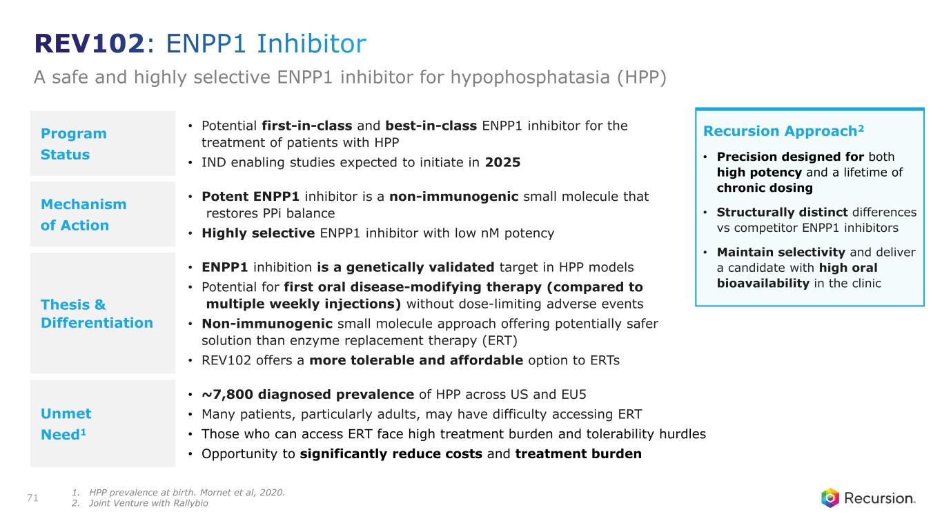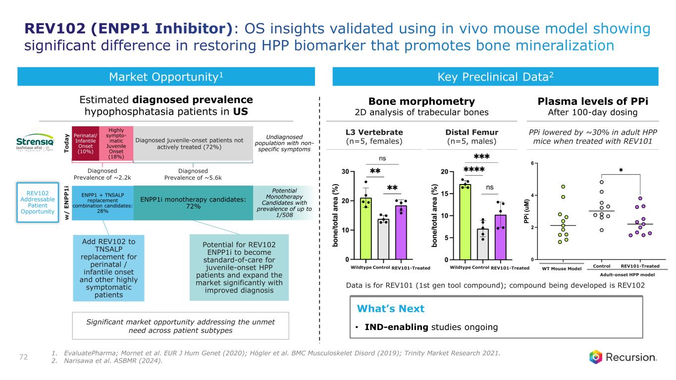 Program Status • Potential first-in-class and best-in-class ENPP1 inhibitor for the treatment of patients with HPP • IND enabling studies expected to initiate in 2025 Mechanism of Action • Potent ENPP1 inhibitor is a non-immunogenic small molecule that restores PPi balance • Highly selective ENPP1 inhibitor with low nM potency Thesis & Differentiation • ENPP1 inhibition is a genetically validated target in HPP models • Potential for first oral disease-modifying therapy (compared to multiple weekly injections) without dose-limiting adverse events • Non-immunogenic small molecule approach offering potentially safer solution than enzyme replacement therapy (ERT) • REV102 offers a more tolerable and affordable option to ERTs Unmet Need1 • ~7,800 diagnosed prevalence of HPP across US and EU5 • Many patients, particularly adults, may have difficulty accessing ERT • Those who can access ERT face high treatment burden and tolerability hurdles • Opportunity to significantly reduce costs and treatment burden 71 Recursion Approach2 • Precision designed for both high potency and a lifetime of chronic dosing • Structurally distinct differences vs competitor ENPP1 inhibitors • Maintain selectivity and deliver a candidate with high oral bioavailability in the clinic REV102: ENPP1 Inhibitor A safe and highly selective ENPP1 inhibitor for hypophosphatasia (HPP) 1. HPP prevalence at birth. Mornet et al, 2020. 2. Joint Venture with Rallybio