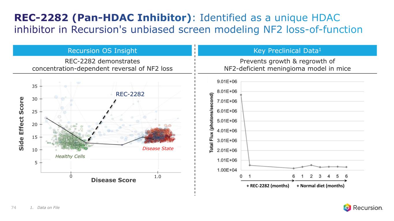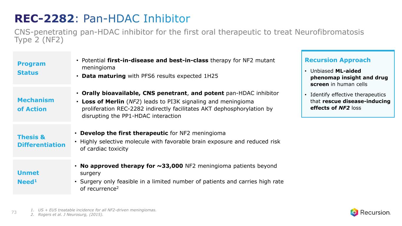 Program Status • Potential first-in-disease and best-in-class therapy for NF2 mutant meningioma • Data maturing with PFS6 results expected 1H25 Mechanism of Action • Orally bioavailable, CNS penetrant, and potent pan-HDAC inhibitor • Loss of Merlin (NF2) leads to PI3K signaling and meningioma proliferation REC-2282 indirectly facilitates AKT dephosphorylation by disrupting the PP1-HDAC interaction Thesis & Differentiation • Develop the first therapeutic for NF2 meningioma • Highly selective molecule with favorable brain exposure and reduced risk of cardiac toxicity Unmet Need1 • No approved therapy for ~33,000 NF2 meningioma patients beyond surgery • Surgery only feasible in a limited number of patients and carries high rate of recurrence2 73 Recursion Approach • Unbiased ML-aided phenomap insight and drug screen in human cells • Identify effective therapeutics that rescue disease-inducing effects of NF2 loss REC-2282: Pan-HDAC Inhibitor CNS-penetrating pan-HDAC inhibitor for the first oral therapeutic to treat Neurofibromatosis Type 2 (NF2) 1. US + EU5 treatable incidence for all NF2-driven meningiomas. 2. Rogers et al. J Neurosurg, (2015).