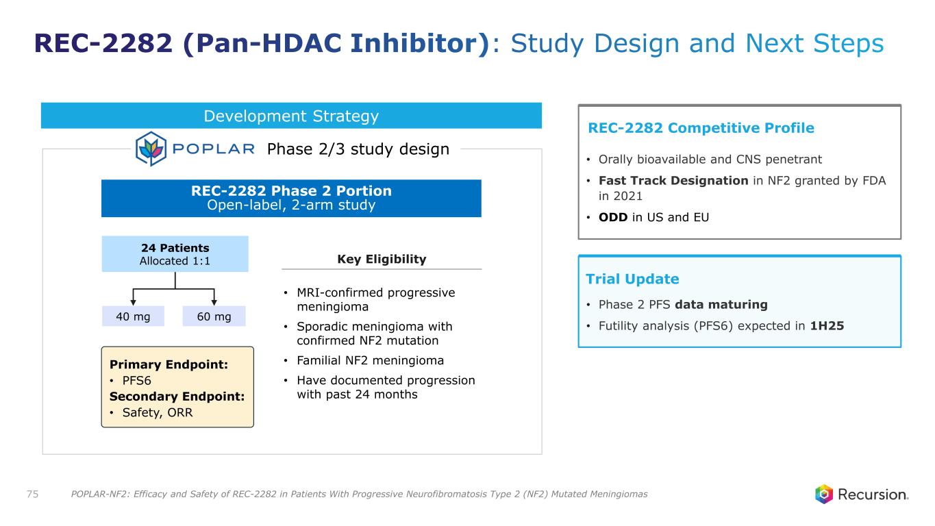 REC-2282 S id e E ff e c t S c o r e Disease Score 0 1.0 30 25 35 20 15 10 5 Disease State Healthy Cells + REC-2282 (months) + Normal diet (months) Recursion OS Insight Key Preclinical Data1 74 Prevents growth & regrowth of NF2-deficient meningioma model in mice REC-2282 demonstrates concentration-dependent reversal of NF2 loss REC-2282 (Pan-HDAC Inhibitor): Identified as a unique HDAC inhibitor in Recursion's unbiased screen modeling NF2 loss-of-function 1. Data on File