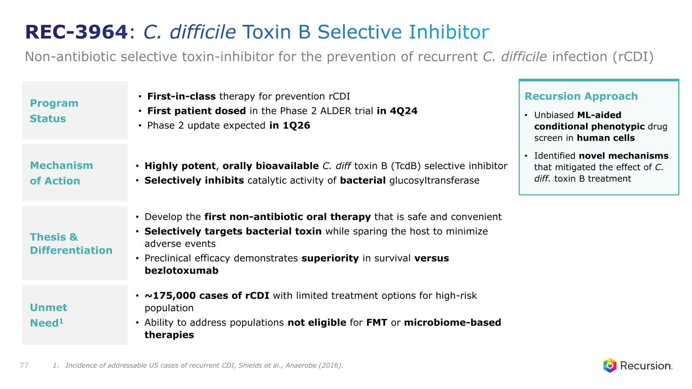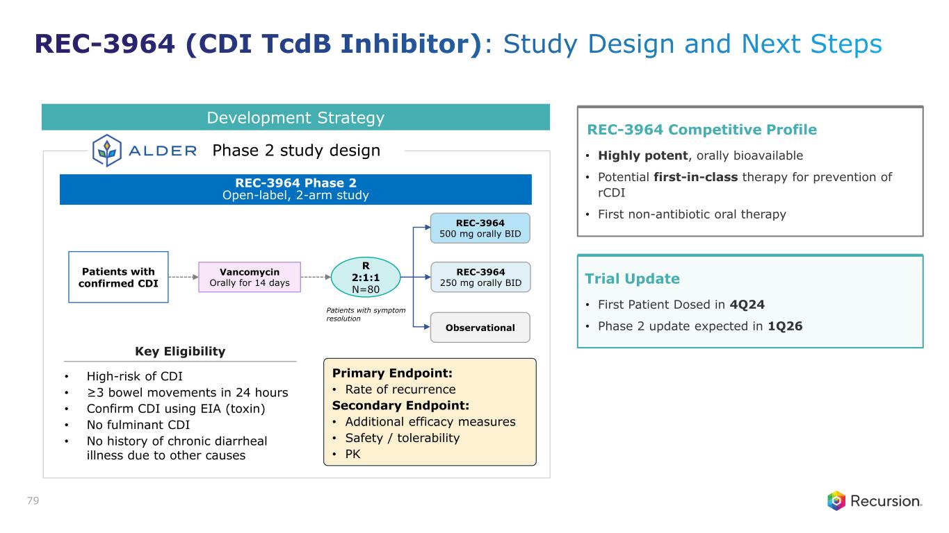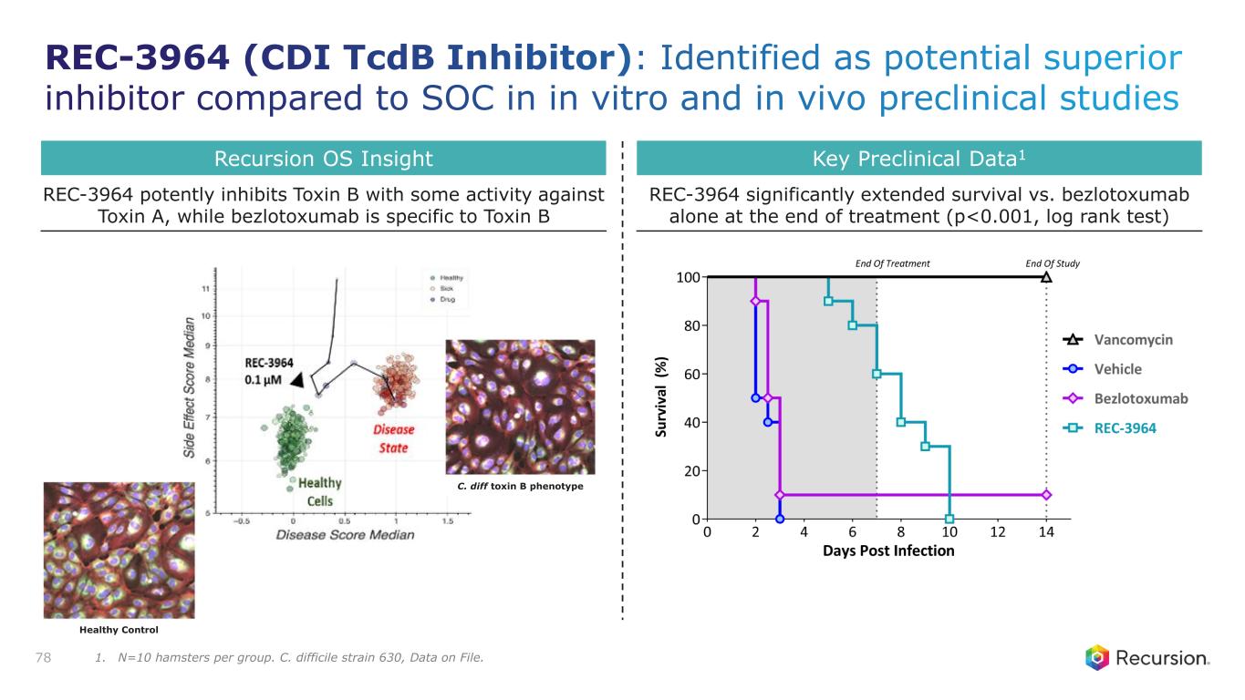 Program Status • First-in-class therapy for prevention rCDI • First patient dosed in the Phase 2 ALDER trial in 4Q24 • Phase 2 update expected in 1Q26 Mechanism of Action • Highly potent, orally bioavailable C. diff toxin B (TcdB) selective inhibitor • Selectively inhibits catalytic activity of bacterial glucosyltransferase Thesis & Differentiation • Develop the first non-antibiotic oral therapy that is safe and convenient • Selectively targets bacterial toxin while sparing the host to minimize adverse events • Preclinical efficacy demonstrates superiority in survival versus bezlotoxumab Unmet Need1 • ~175,000 cases of rCDI with limited treatment options for high-risk population • Ability to address populations not eligible for FMT or microbiome-based therapies 77 Recursion Approach • Unbiased ML-aided conditional phenotypic drug screen in human cells • Identified novel mechanisms that mitigated the effect of C. diff. toxin B treatment REC-3964: C. difficile Toxin B Selective Inhibitor Non-antibiotic selective toxin-inhibitor for the prevention of recurrent C. difficile infection (rCDI) 1. Incidence of addressable US cases of recurrent CDI, Shields et al., Anaerobe (2016).