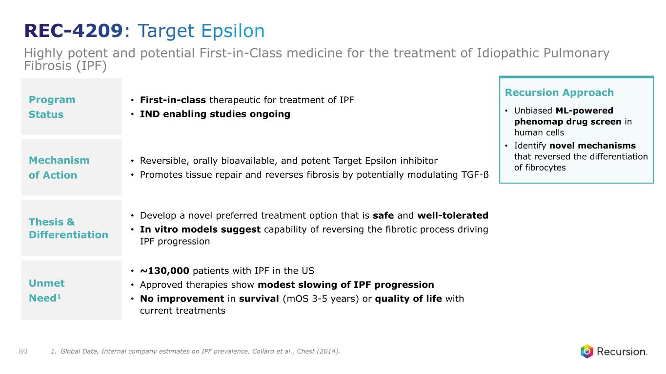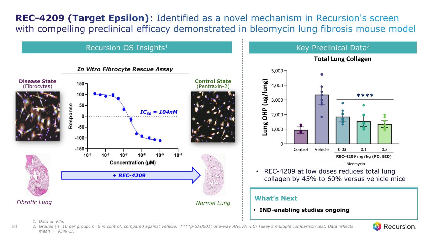Program Status • First-in-class therapeutic for treatment of IPF • IND enabling studies ongoing Mechanism of Action • Reversible, orally bioavailable, and potent Target Epsilon inhibitor • Promotes tissue repair and reverses fibrosis by potentially modulating TGF-ß Thesis & Differentiation • Develop a novel preferred treatment option that is safe and well-tolerated • In vitro models suggest capability of reversing the fibrotic process driving IPF progression Unmet Need1 • ~130,000 patients with IPF in the US • Approved therapies show modest slowing of IPF progression • No improvement in survival (mOS 3-5 years) or quality of life with current treatments 80 Recursion Approach • Unbiased ML-powered phenomap drug screen in human cells • Identify novel mechanisms that reversed the differentiation of fibrocytes REC-4209: Target Epsilon Highly potent and potential First-in-Class medicine for the treatment of Idiopathic Pulmonary Fibrosis (IPF) 1. Global Data, Internal company estimates on IPF prevalence, Collard et al., Chest (2014).