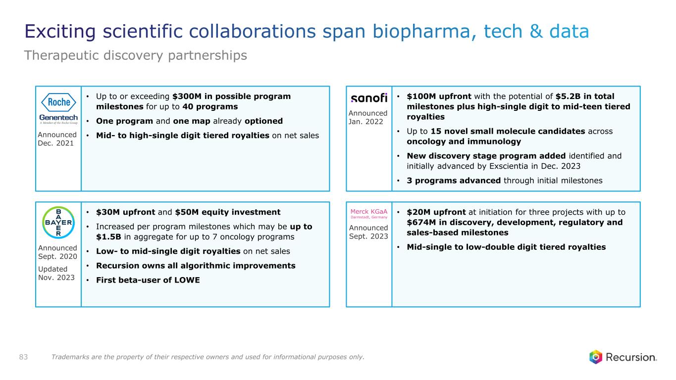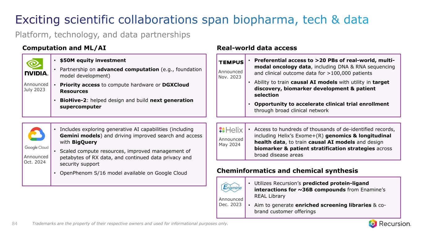 83 • Up to or exceeding $300M in possible program milestones for up to 40 programs • One program and one map already optioned • Mid- to high-single digit tiered royalties on net sales • $30M upfront and $50M equity investment • Increased per program milestones which may be up to $1.5B in aggregate for up to 7 oncology programs • Low- to mid-single digit royalties on net sales • Recursion owns all algorithmic improvements • First beta-user of LOWE • $100M upfront with the potential of $5.2B in total milestones plus high-single digit to mid-teen tiered royalties • Up to 15 novel small molecule candidates across oncology and immunology • New discovery stage program added identified and initially advanced by Exscientia in Dec. 2023 • 3 programs advanced through initial milestones • $20M upfront at initiation for three projects with up to $674M in discovery, development, regulatory and sales-based milestones • Mid-single to low-double digit tiered royalties Announced Dec. 2021 Announced Jan. 2022 Announced Sept. 2023 Announced Sept. 2020 Updated Nov. 2023 Exciting scientific collaborations span biopharma, tech & data Therapeutic discovery partnerships Trademarks are the property of their respective owners and used for informational purposes only.