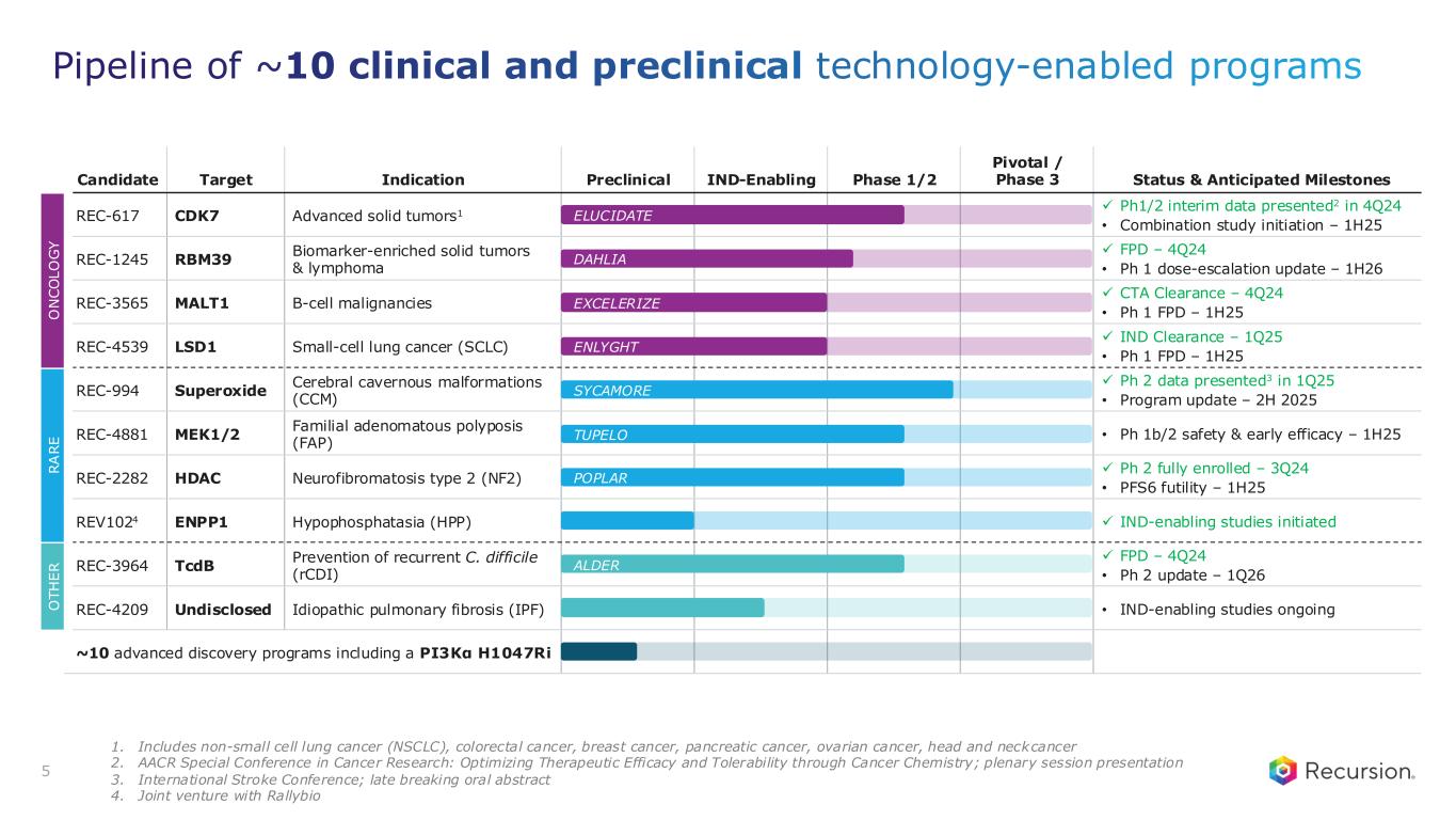 3 4 Large pharma collaborations 10 Clinical and pre- clinical programs1 Oncology, rare diseases, and other high unmet need diseases ~10 Clinical program milestones over the next 18 months2 1 Unified Operating System (OS) with both first & best-in-class capabilities ~10 Additional advanced discovery programs 10+ Partnered programs ~$450M Upfront and milestone payments earned to-date ~$20B potential milestone payments Oncology, immunology, and other high unmet need diseases Portfolio poised for value creation with waves of new pipeline and partner programs emerging from Recursion OS 1. Includes preclinical programs (programs expected to enter the clinic within the next 18 months). 2. Program milestones includes data readouts, preliminary data updates, regulatory submissions, trial initiation, etc.