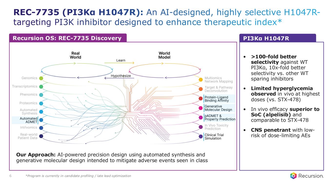 O T H E R R A R E O N C O L O G Y Candidate Target Indication Preclinical IND-Enabling Phase 1/2 Pivotal / Phase 3 Status & Anticipated Milestones REC-617 CDK7 Advanced solid tumors1 ✓ Ph1/2 interim data presented2 in 4Q24 • Combination study initiation – 1H25 REC-1245 RBM39 Biomarker-enriched solid tumors & lymphoma ✓ FPD – 4Q24 • Ph 1 dose-escalation update – 1H26 REC-3565 MALT1 B-cell malignancies ✓ CTA Clearance – 4Q24 • Ph 1 FPD – 1H25 REC-4539 LSD1 Small-cell lung cancer (SCLC) ✓ IND Clearance – 1Q25 • Ph 1 FPD – 1H25 REC-994 Superoxide Cerebral cavernous malformations (CCM) ✓ Ph 2 data presented3 in 1Q25 • Program update – 2H 2025 REC-4881 MEK1/2 Familial adenomatous polyposis (FAP) • Ph 1b/2 safety & early efficacy – 1H25 REC-2282 HDAC Neurofibromatosis type 2 (NF2) ✓ Ph 2 fully enrolled – 3Q24 • PFS6 futility – 1H25 REV1024 ENPP1 Hypophosphatasia (HPP) ✓ IND-enabling studies initiated REC-3964 TcdB Prevention of recurrent C. difficile (rCDI) ✓ FPD – 4Q24 • Ph 2 update – 1Q26 REC-4209 Undisclosed Idiopathic pulmonary fibrosis (IPF) • IND-enabling studies ongoing ~10 advanced discovery programs including a PI3Kα H1047Ri ELUCIDATE POPLAR ALDER TUPELO SYCAMORE EXCELERIZE ENLYGHT DAHLIA 5 Pipeline of ~10 clinical and preclinical technology-enabled programs 1. Includes non-small cell lung cancer (NSCLC), colorectal cancer, breast cancer, pancreatic cancer, ovarian cancer, head and neck cancer 2. AACR Special Conference in Cancer Research: Optimizing Therapeutic Efficacy and Tolerability through Cancer Chemistry; plenary session presentation 3. International Stroke Conference; late breaking oral abstract 4. Joint venture with Rallybio