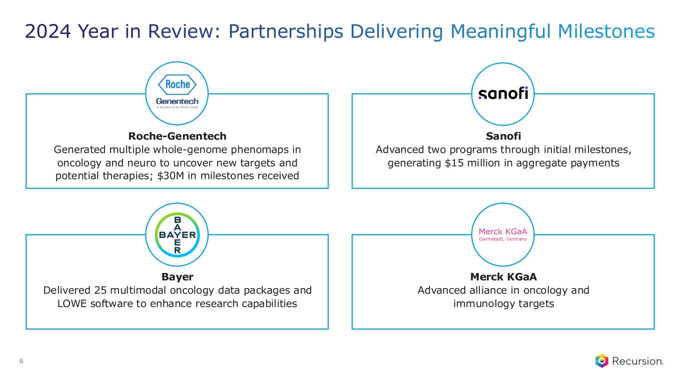 2024 Year in Review: Our Platform Leads the Industry in Data, Models, and Compute Compute: • Built Biohive-2 with NVIDIA, believed to be the most powerful wholly-owned and operated supercomputer in biopharma Data Capabilities: • Mapped 1.4 million active ligands to binding pockets for structure-based drug discovery and target deconvolution • Generating up to 16.2M multi-timepoint brightfield images per week • Produced just under 1 million transcriptomes this year (>1.6 million since launch in 2023), including the first genome-scale CRISPR knockout map in primary human cells Foundation Models: • Phenom-2: improves genetic perturbation separation by 60% • MolPhenix: 10X improvement in predicting molecule effects on cell assays compared to previous models • MolGPS: Outperforms state-of-the-art models on 12 of 22 ADMET tasks1 Causal AI models and ClinTech: • Utilizing AI models and Tempus data to build a patient stratification framework in SCLC • Automating site engagement and enrollment to accelerate patient matching 7 1. Ranked in the TDC (Therapeutics Data Commons)