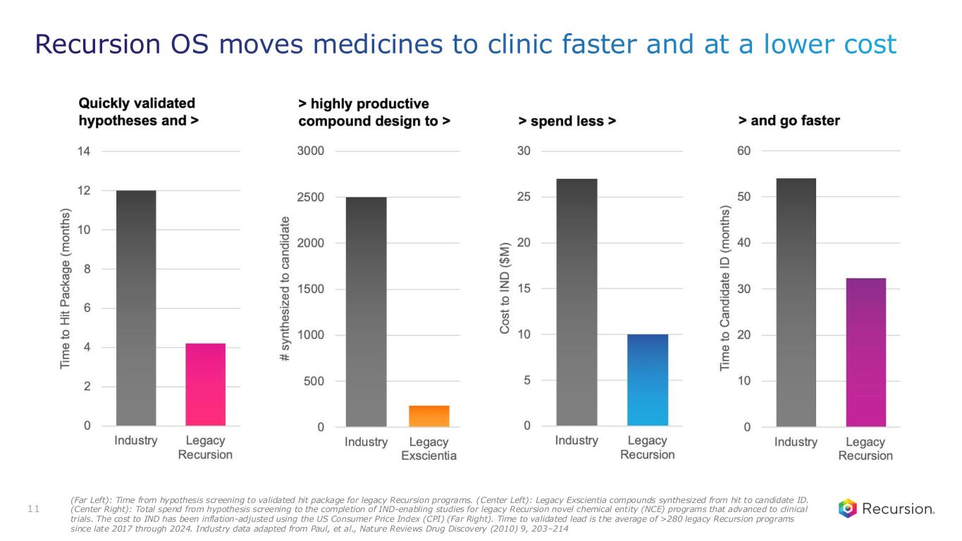 10 Recursion OS moves medicines to clinic faster and at a lower cost (Far Left): Time from hypothesis screening to validated hit package for legacy Recursion programs. (Center Left): Legacy Exscientia compounds synthesized from hit to candidate ID. (Center Right): Total spend from hypothesis screening to the completion of IND-enabling studies for legacy Recursion novel chemical entity (NCE) programs that advanced to clinical trials. The cost to IND has been inflation-adjusted using the US Consumer Price Index (CPI) (Far Right). Time to validated lead is the average of >280 legacy Recursion programs since late 2017 through 2024. Industry data adapted from Paul, et al., Nature Reviews Drug Discovery (2010) 9, 203–214
