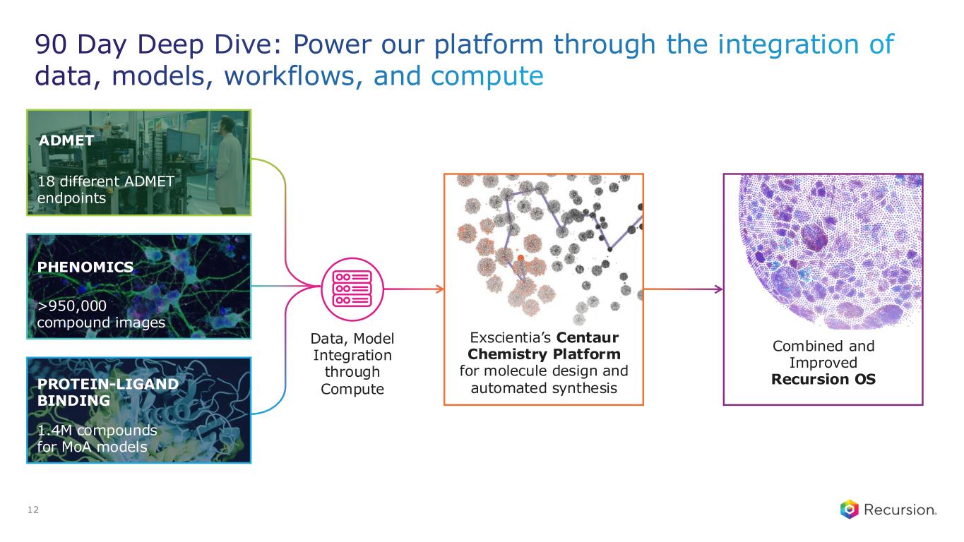 On-track to deliver at least $100M in synergies from the business-combination 11 Operating Expense Update • At least $100 million in synergies with majority of the run rate amount achieved in 2025 • Carved out Vienna operations with 49% ownership in a newly formed company focused on precision oncology, Alpha Biotechnology GmbH • On-track to sub-lease multiple legacy sites • The company will provide a comprehensive update in May 2025 FY2024 REVENUE FY24 pro forma revenue $82.6 million1 CASH $603 million in cash, cash equivalents and restricted cash2 1. Unaudited pro forma consolidated revenue is presented as if the Exscientia business combination had occurred on January 1, 2023. U.S GAAP revenue was $58.8 million in the Recursion consolidated financial statements 2. Recursion noted that the change in Exscientia’s cash and cash equivalents and short term bank deposits from December 31, 2023 to November 20, 2024, the date of the close of the acquisition was $184 million Expected cash runway into 2027