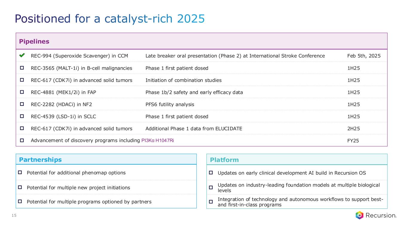 Positioned for a catalyst-rich 2025 12 Pipelines REC-994 (Superoxide Scavenger) in CCM Late breaker oral presentation (Phase 2) at International Stroke Conference Feb 5th, 2025 REC-3565 (MALT-1i) in B-cell malignancies Phase 1 first patient dosed 1H25 REC-617 (CDK7i) in advanced solid tumors Initiation of combination studies 1H25 REC-4881 (MEK1/2i) in FAP Phase 1b/2 safety and early efficacy data 1H25 REC-2282 (HDACi) in NF2 PFS6 futility analysis 1H25 REC-4539 (LSD-1i) in SCLC Phase 1 first patient dosed 1H25 REC-617 (CDK7i) in advanced solid tumors Additional Phase 1 data from ELUCIDATE 2H25 Advancement of discovery programs including PI3Kα H1047Ri FY25 Partnerships Potential for additional phenomap options Potential for multiple new project initiations Potential for multiple programs optioned by partners Platform Updates on early clinical development AI build in Recursion OS Updates on industry-leading foundation models at multiple biological levels Integration of technology and autonomous workflows to support best- and first-in-class programs