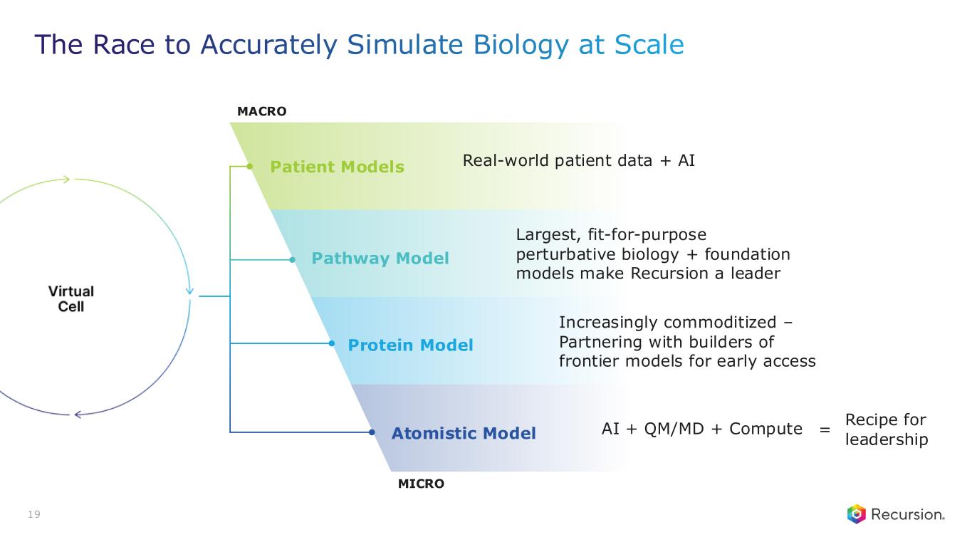MICRO Pathway Model MACRO Largest, fit-for-purpose perturbative biology + foundation models make Recursion a leader Protein Model Increasingly commoditized – Partnering with builders of frontier models for early access Atomistic Model AI + QM/MD + Compute = Recipe for leadership 19 The Race to Accurately Simulate Biology at Scale Patient Models Real-world patient data + AI